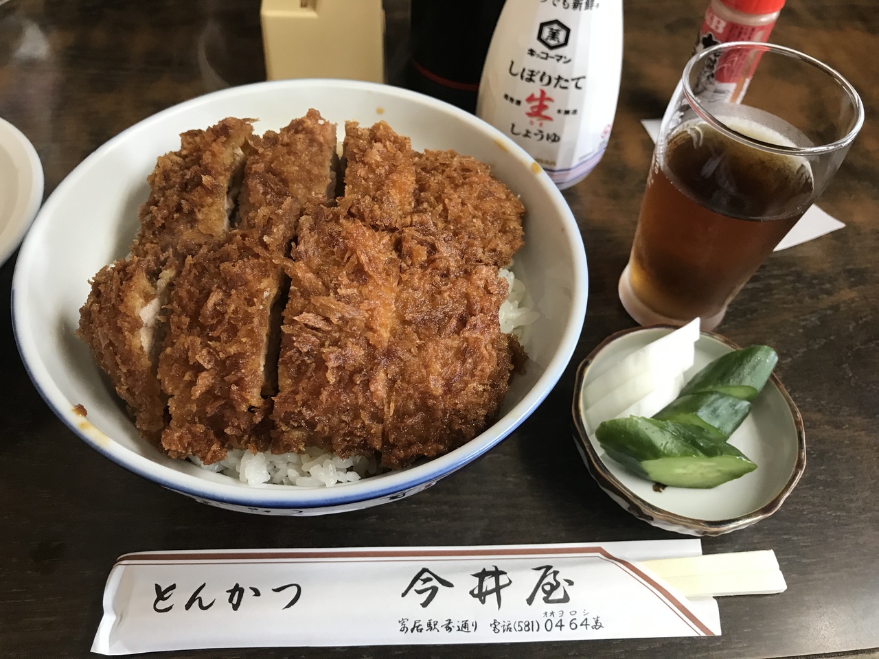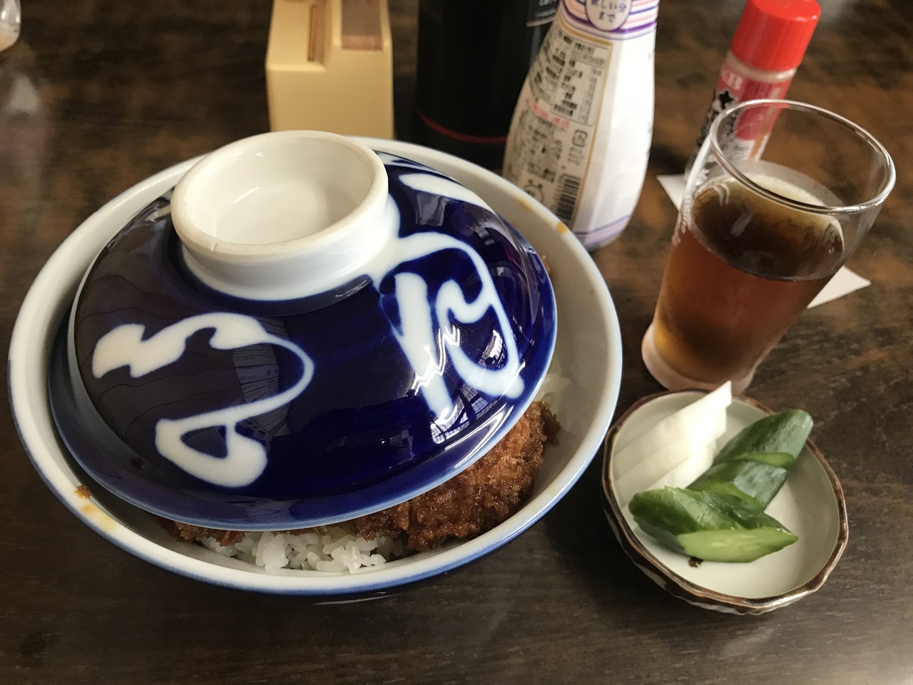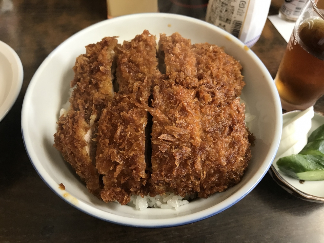 カツ丼は揚げたてのカツが2枚。少し甘めのタレがちょうど良い塩梅で浸かっている感じ。カツはタレがしみているのにサクサク。ご飯はお茶碗2杯分くらいありそうだが、豚肉は脂っぽくなくペロリといける。こテーブル上にある七味唐辛子をかけてみるのも良い。自家製と思われる胡瓜と大根の漬物で締めにするのも良い。