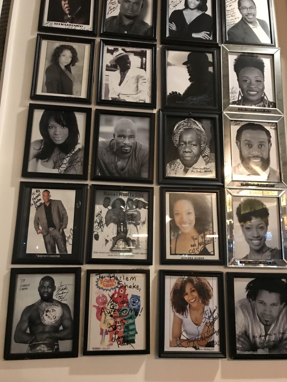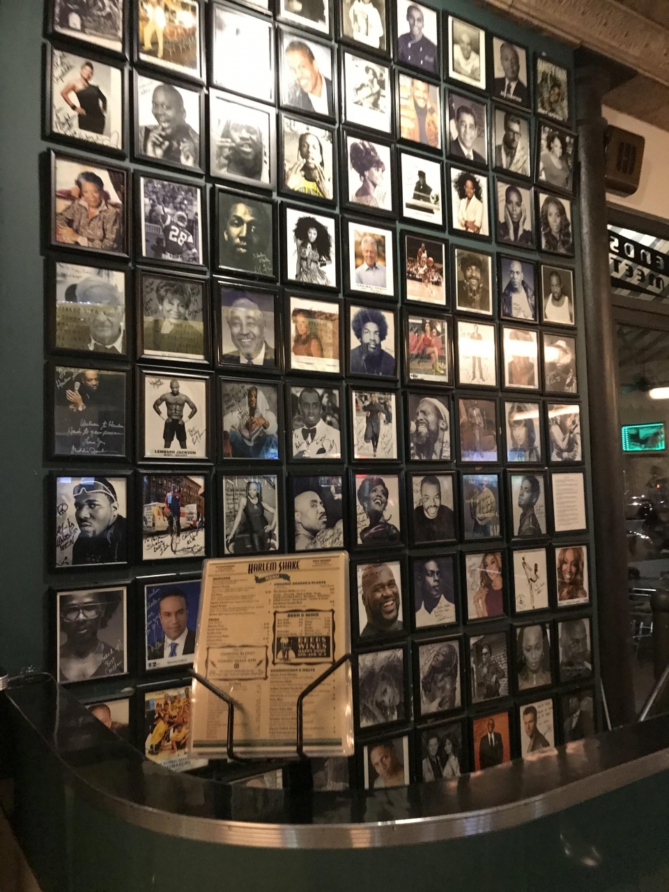 お店は少しレトロ調な外観及び内装。なんとなくだが、昔のアメリカ映画の1シーンの中にいる気分。壁の一部にはハーレムゆかりの有名人の写真パネルが掛かってます。