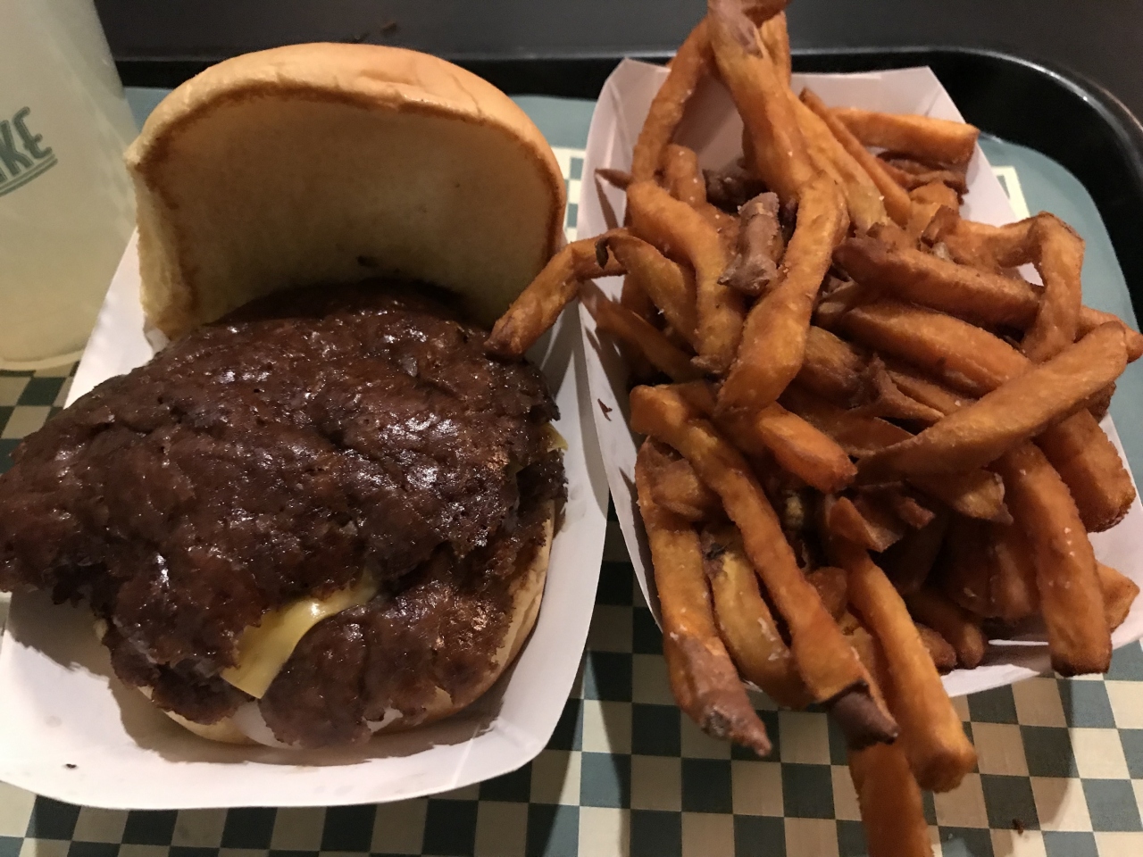少しすると注文した3品が到着。チーズバーガーは薄めのパテが2枚重ね。薄めと言っても充分な厚さ。某ハンバーガーチェーンのようなものではない。噛むとしっかりした肉の味が出てくる。なのでケチャップ、マスタードは少し食べた後にした方が良い。なお、ピクルス等は注文時に追加可能。サイドメニューでのオススメはスイート・ヤムフライ。さつまいもを使ったフライドポテトであるが、カリっと揚げたことにより、さつまいも本来の甘さを味わえる感じ。