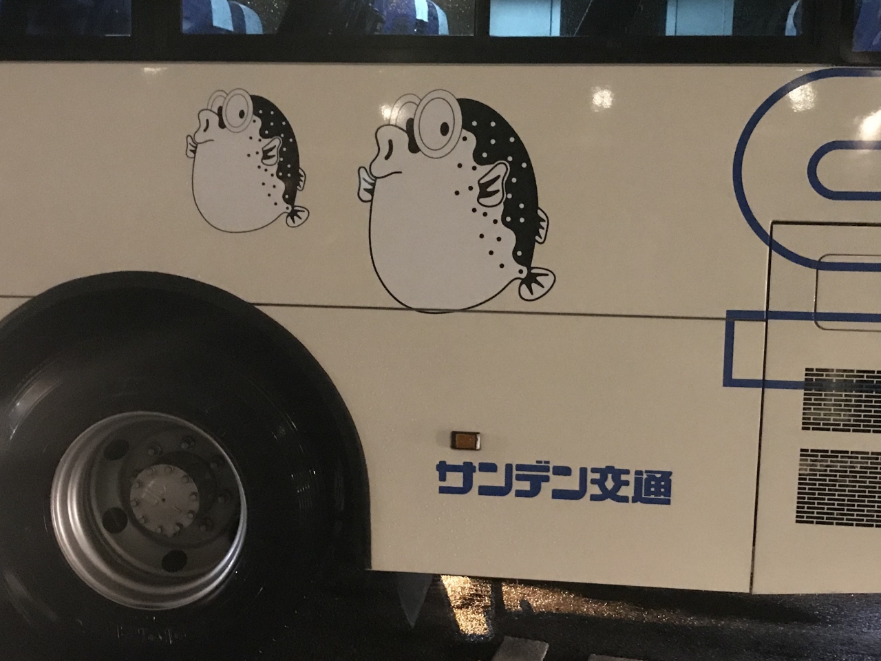 下関市内と山口宇部空港を結ぶリムジンバス。車体には下関名物ふぐ(ふく)のイラストが描かれており、観光客にとっては下関らしさを感じる。