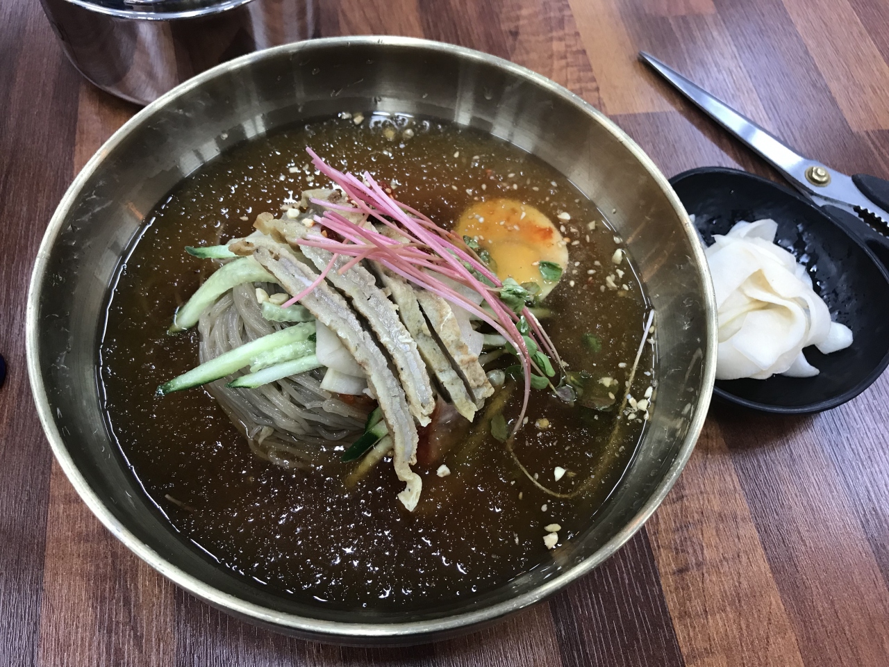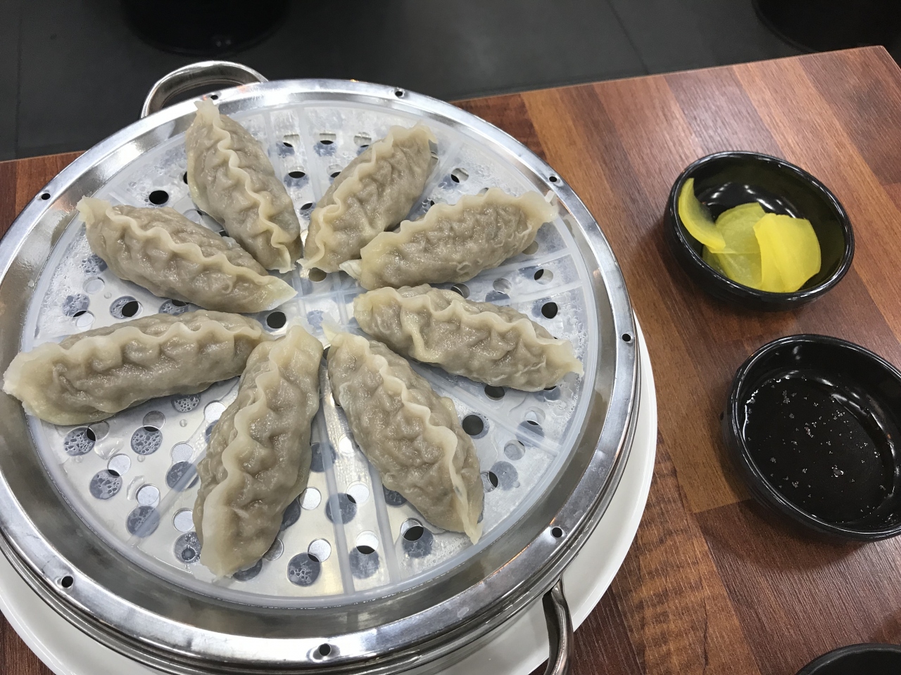 ユクジョンミルミョンの麺は釜山名物のミルミョン(小麦粉の麺)のようだが、蕎麦にが混ざっている感じ。なので、一見メジャーな冷麺の感じ(麺は太めだが)だが、さっぱりしている。麺の上には細長く切っている牛肉のチジミがのっている。チジミがのった麺はは初めて。他に茹で卵、そばの芽、キュウリがちらほら。スープは氷になったものも入っているので冷たくシャリシャリ。意外に美味しい。また、カルビ餃子は牛肉の味がじわりと出てくる。こちらもおすすめ。入って見て正解でした。