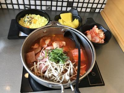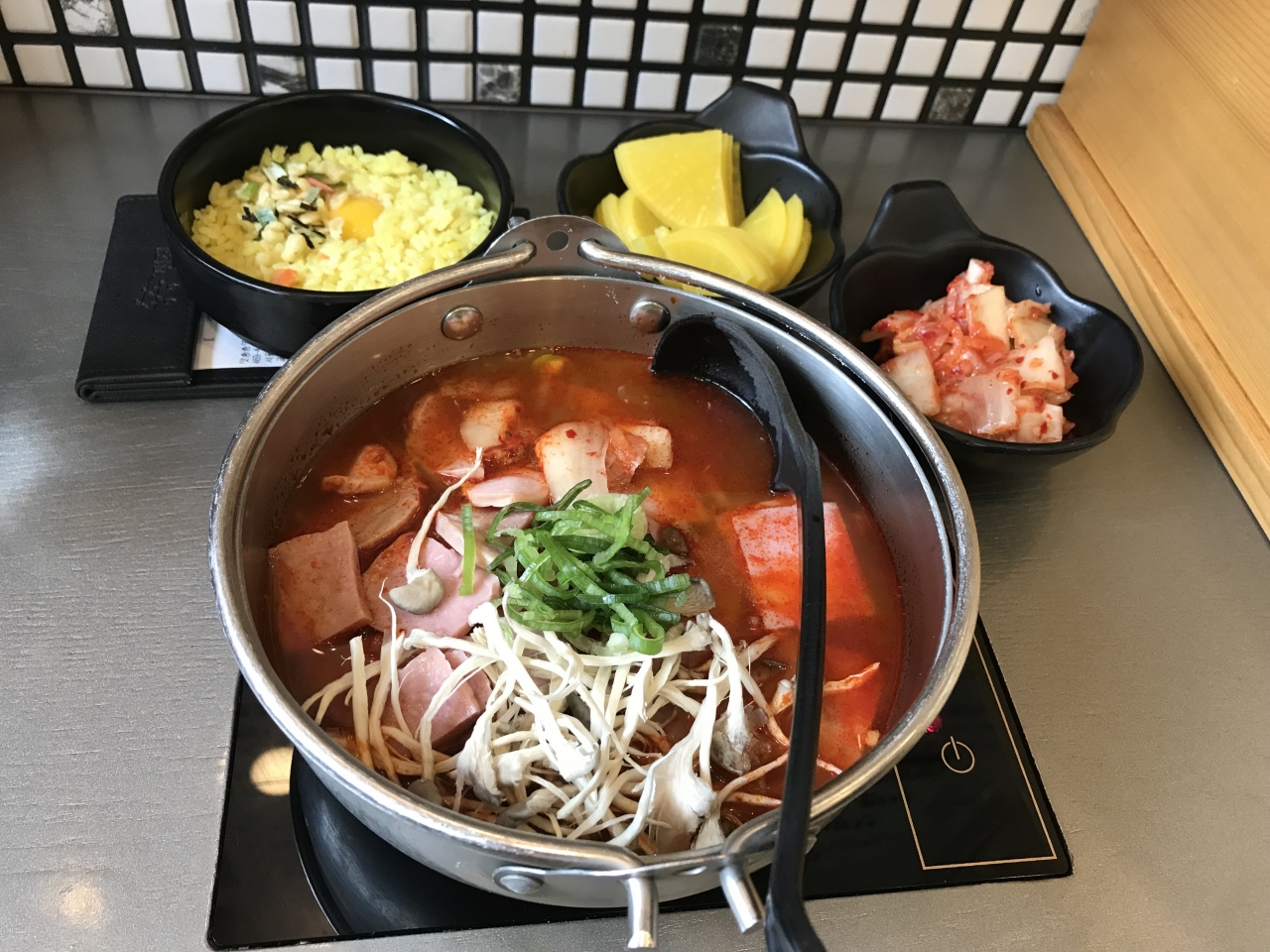 メニューはブテチゲ。細めのうどんと春ウコンで炊いた栄養ごはんの両方がセットされているものが多い。。
