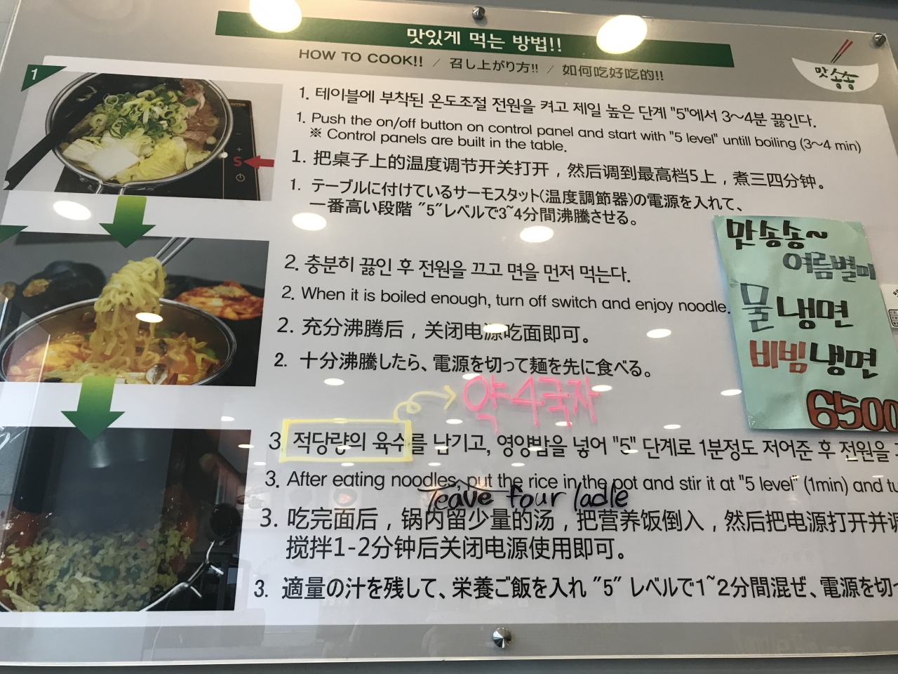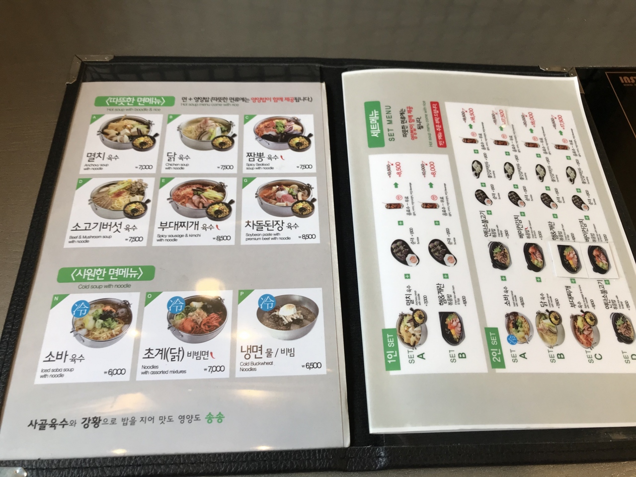 昼時に行ったが、地元の人で結構な行列。一方で看板がすべてハングルなので、店名がわからなかったのだが、お店の外に表示されている看板メニューには日本語表示があったので、思わず入店。