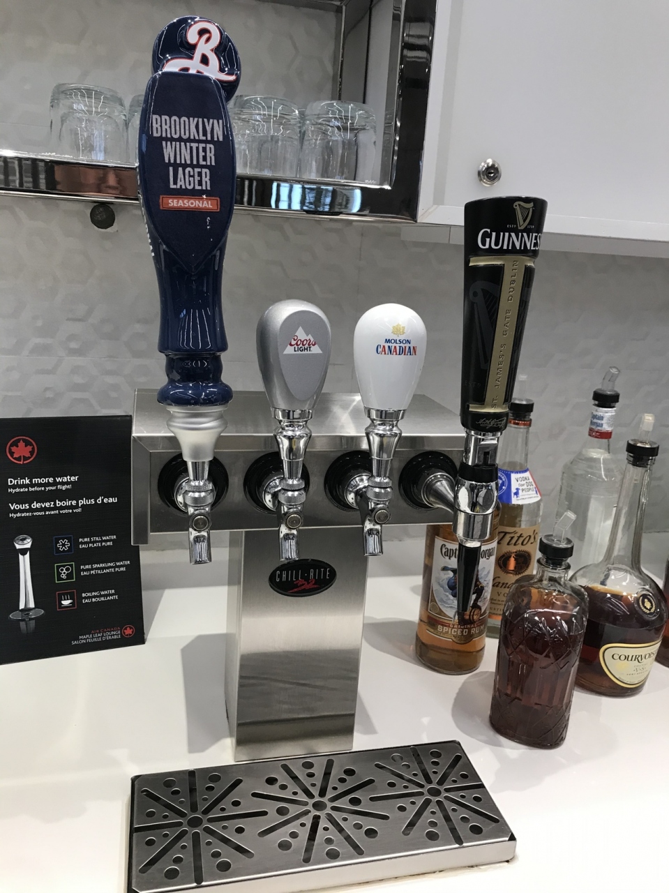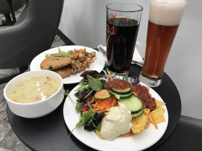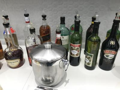 ドリンク類は豊富に用意。アルコール類はアメリカの空港では珍しくセルフのバー形式で種類も豊富。特に生ビールはギネス等4種類。ブルックリン・ブルワリー社のウインターラガーといった地ビールもある。