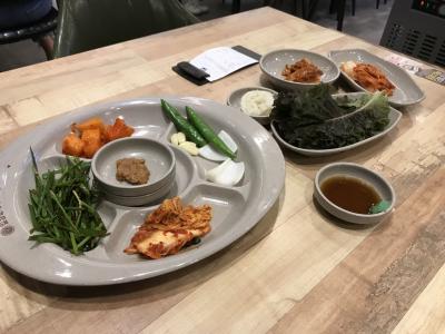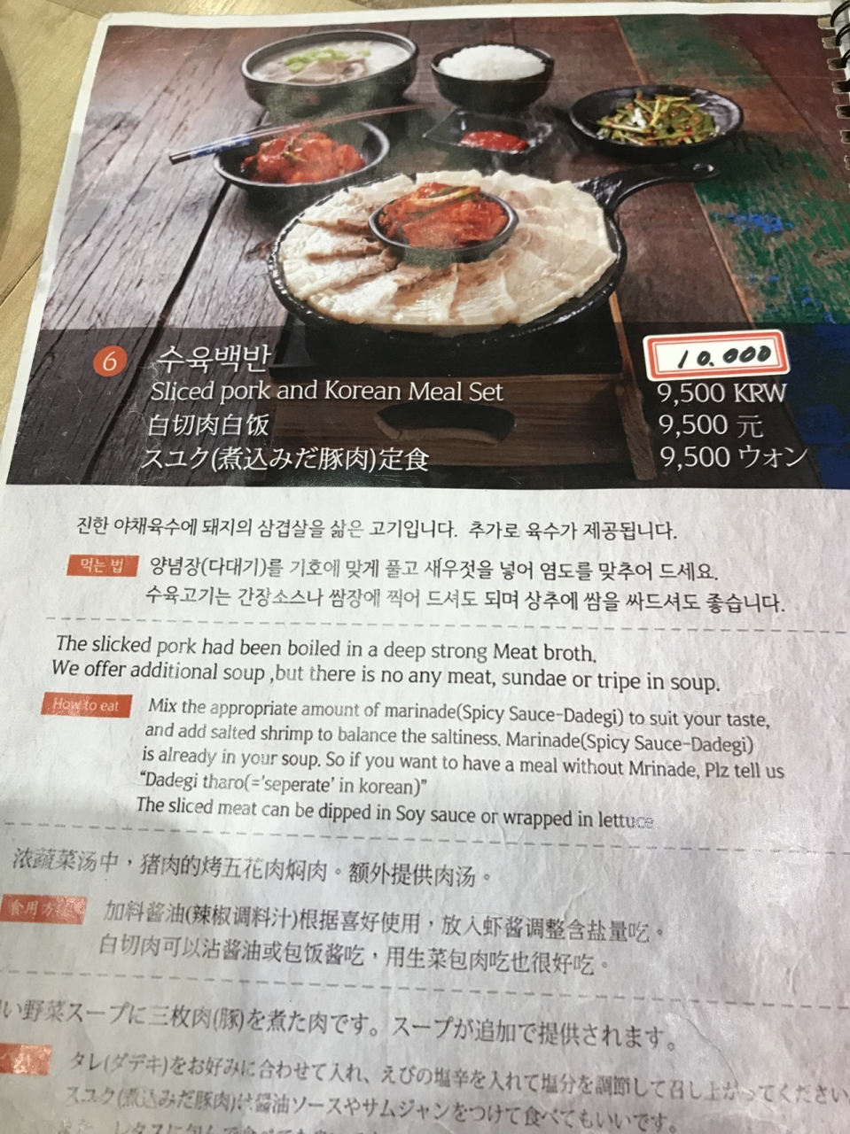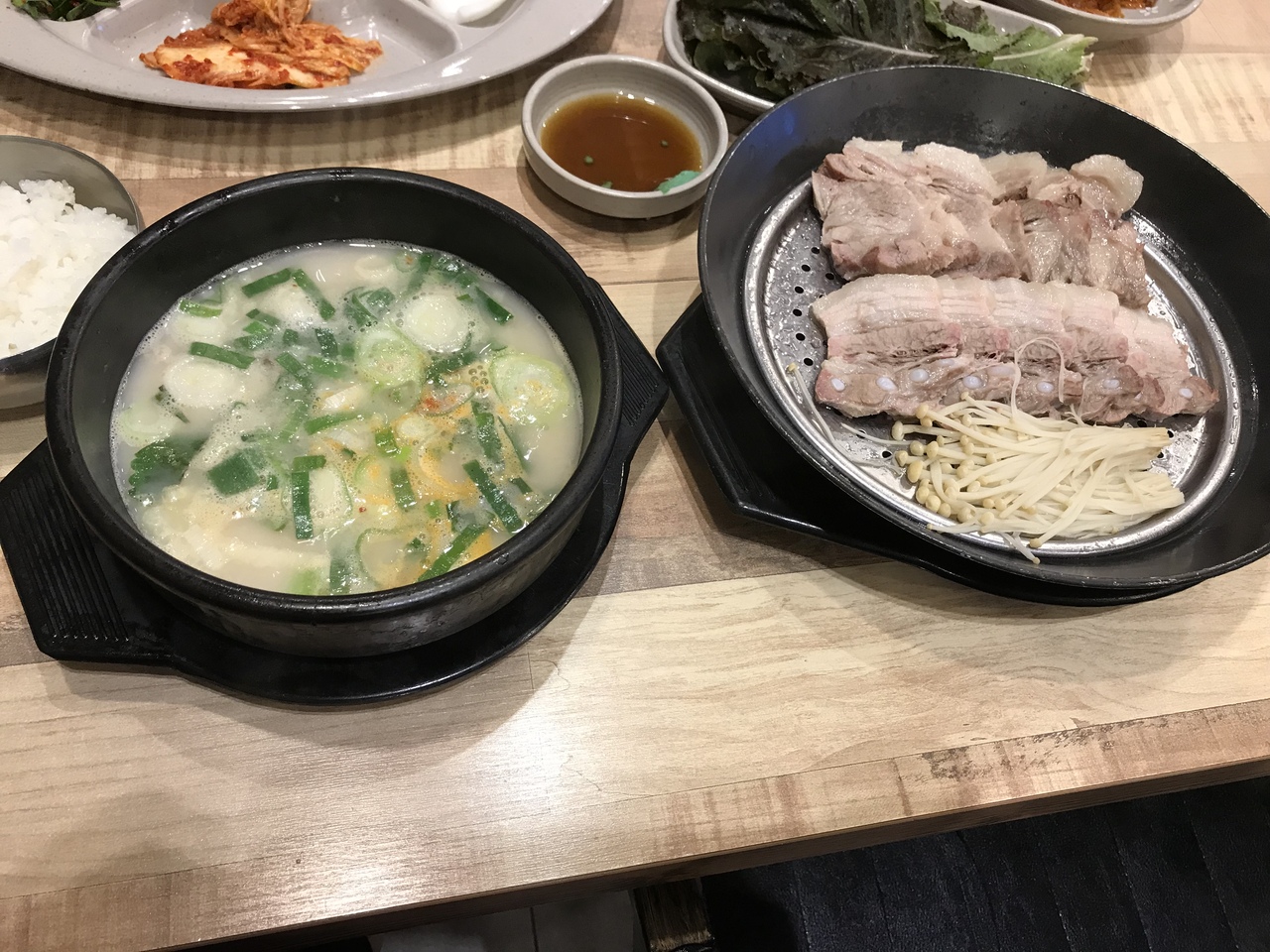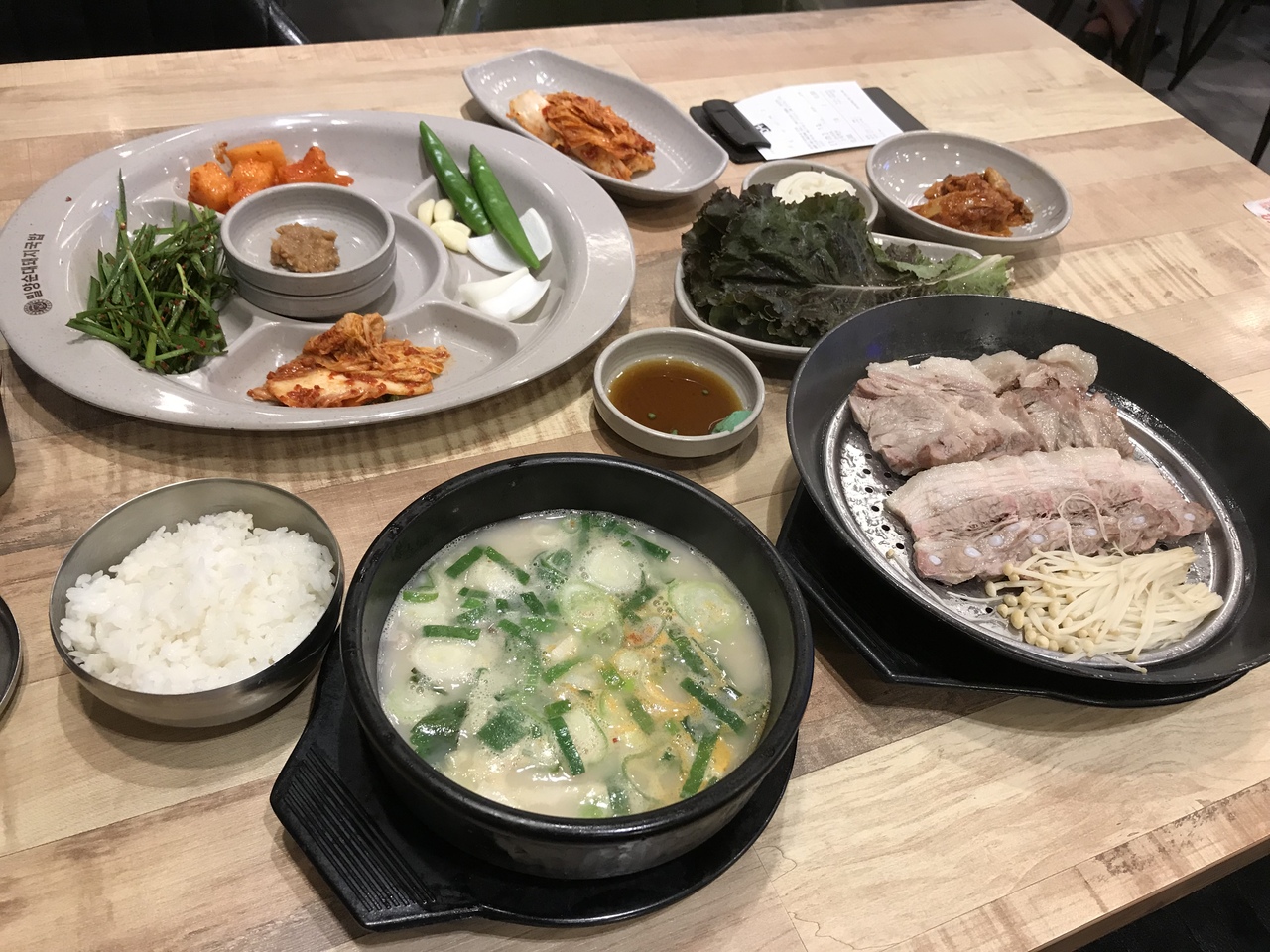 スユク定食を注文。野菜スープで煮た三枚肉(豚肉)と熱々のデジクッパの定食。三枚肉は臭みが無く、さっぱりしている。野菜と一緒に食べると更に美味しい。当然かもしれないが、キムチ、カクテキ、海苔などはスタッフに頼めばおかわりOK。