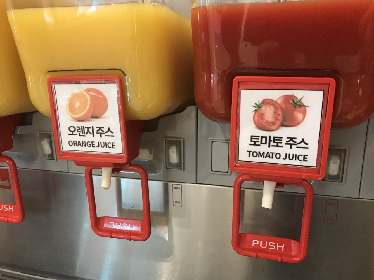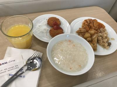 食事は韓国風の中華料理(炒飯、鶏肉のトマト煮、酢豚はケチャップを使っていない酢豚等)や韓国風おかゆ、コロッケ、サンドイッチなどがあったが、味も種類も羽田、成田のANAラウンジ、サクララウンジのような期待はしない方が…。また、ジュース類は日本よりも甘く感じる。特にトマトジュースはめちゃくちゃ甘い。韓国ではトマトは果物の位置づけらしい。- 旅行時期