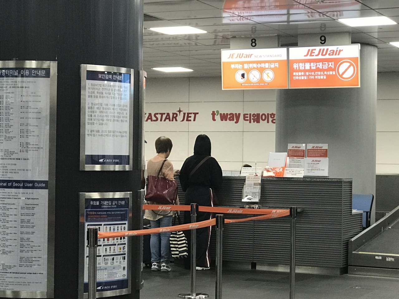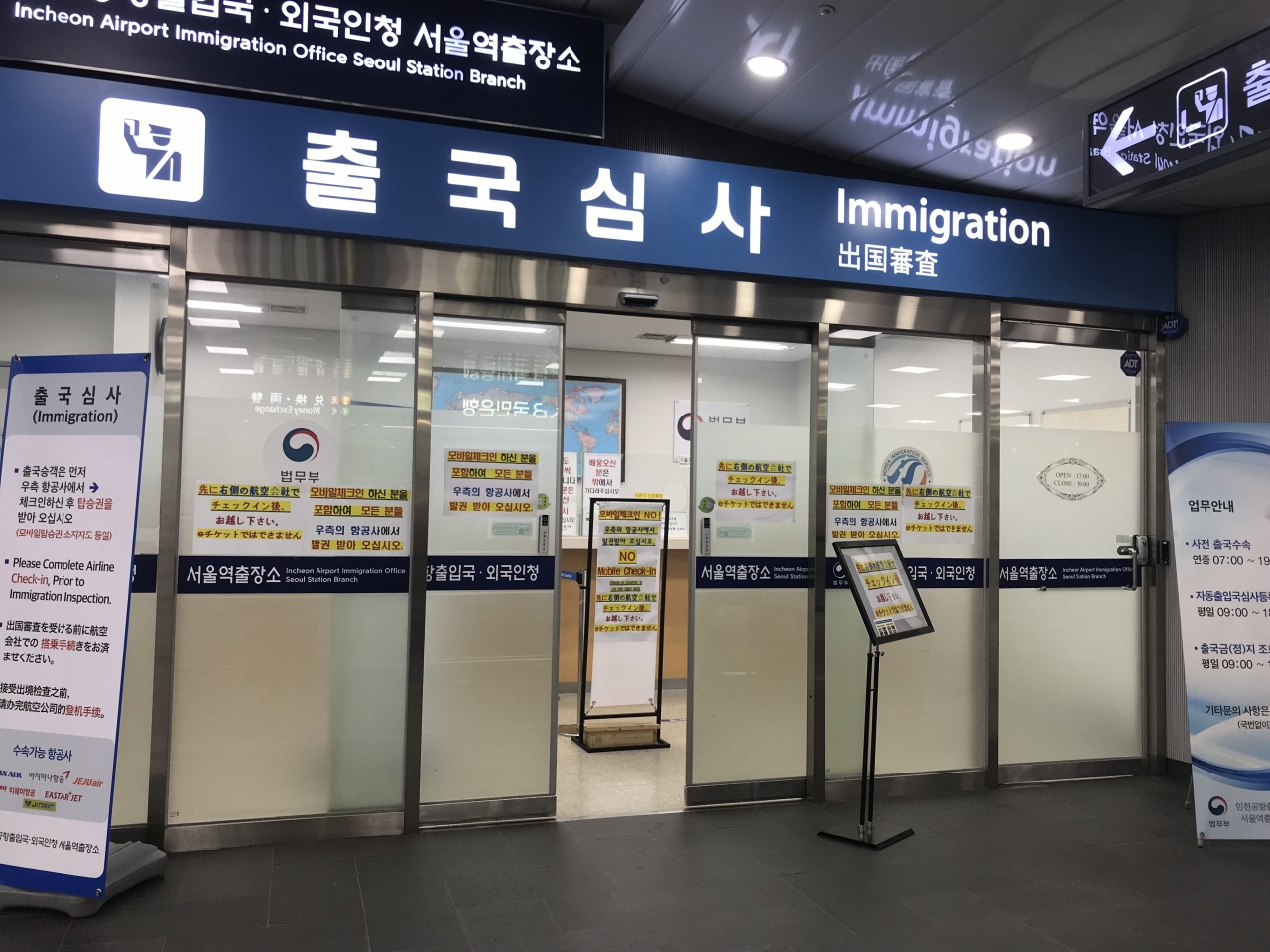 チェックイン及び預入手荷物を行った後は出国審査が利用可能(朝7:00以降)。ここで出国審査を行うと、仁川空港での出国はパイロットや客室乗務員など特定の人のみ利用する専用口の利用ができるので、出国手続きの混雑を避けることが出来、非常に楽な出国が可能。- 旅行時期