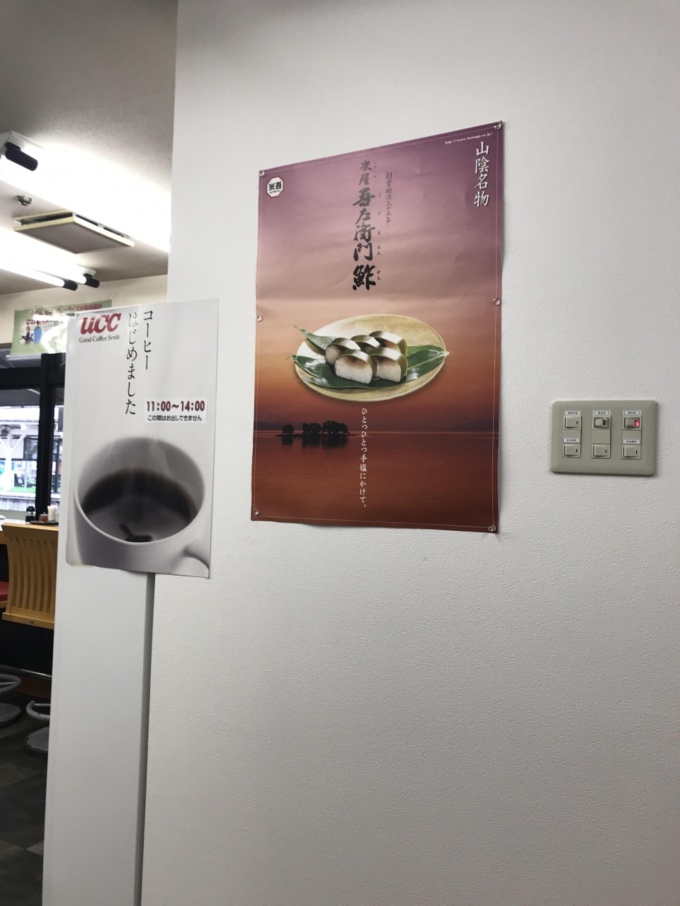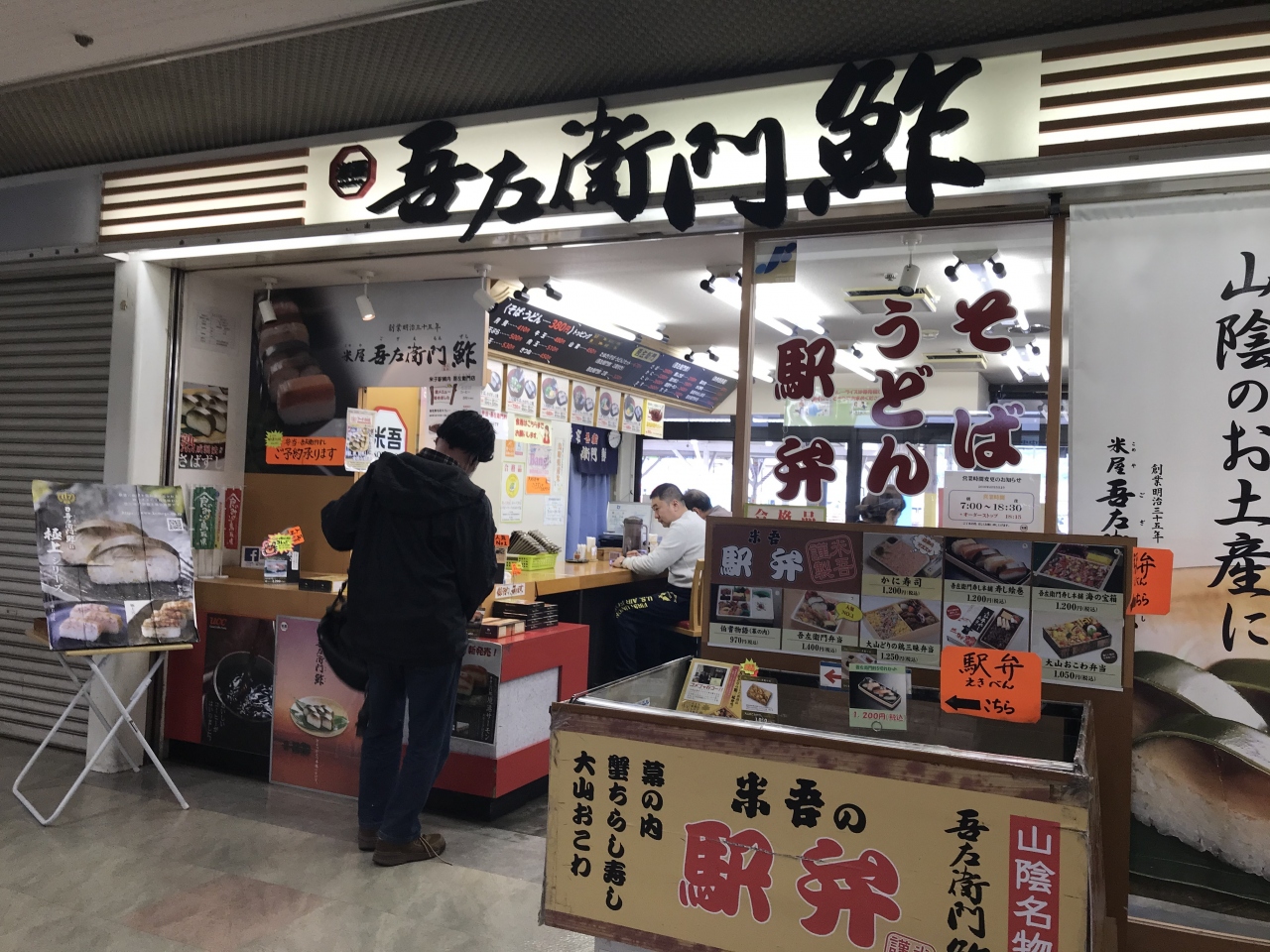 JR米子駅構内にあるそば屋&駅弁屋。吾左衛門鮓(鯖の棒寿司)米子名物として今では都内、大阪等の百貨店や高級スーパーでも販売しているが、発祥は米子駅の駅弁なので、この店ではそばやうどんに鯖の棒寿司をセットしていただくことが可能(2切れを単品でも販売)。一人旅の際、鯖の棒寿司を1本買うのはボリュームがあり、尚且つ少々高額なので少しだけつまめるのは非常に有難い。