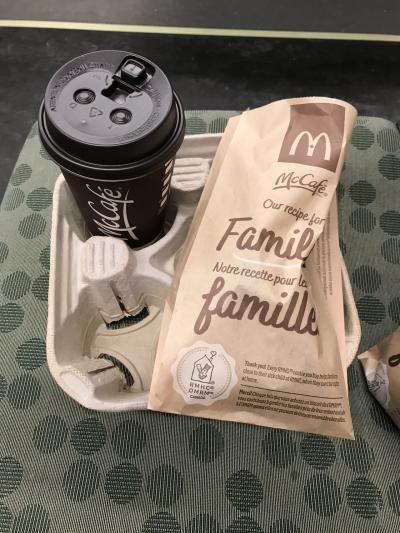 地下の店はテイクアウト専門。店舗もマックカフェと書いてあり、コーヒーとサンドイッチ、クロワッサンなどが中心。車内で食べることを伝えると紙のトレーを用意してくれるのが嬉しい。