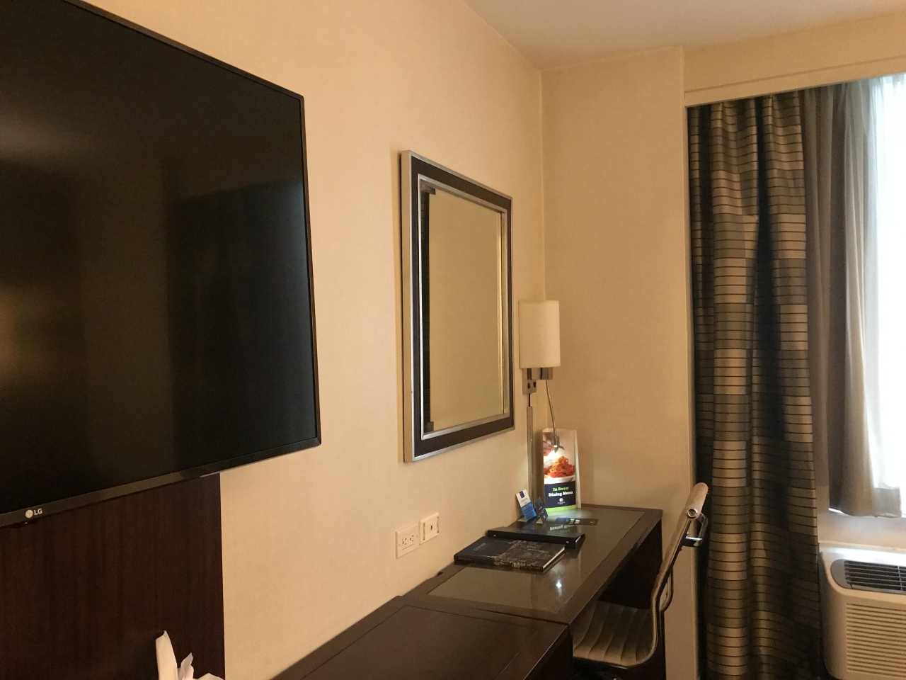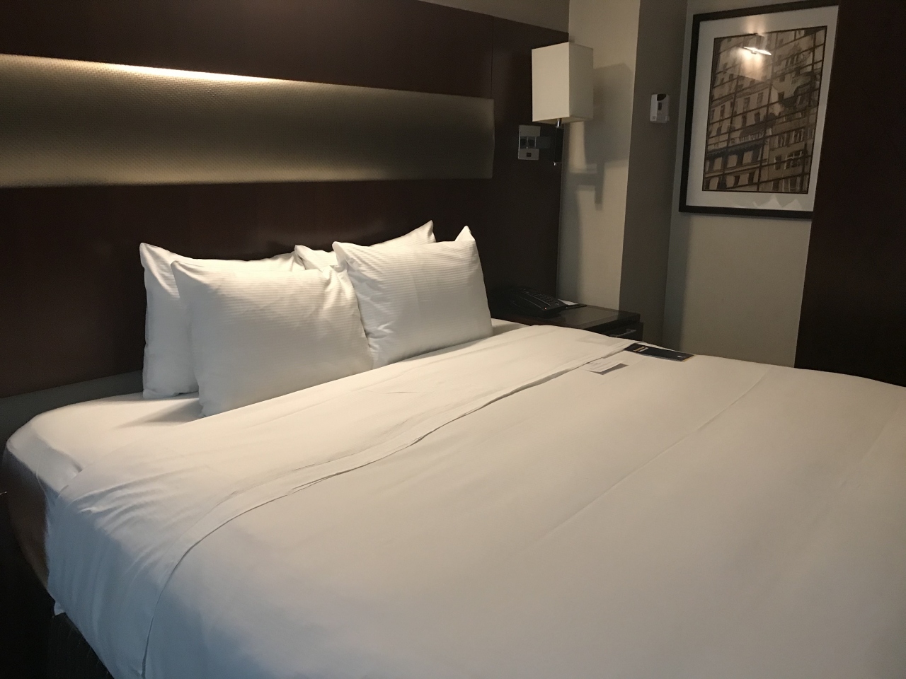 標準的なキングベッドの部屋に宿泊。ベッドはふかふか。寝心地も良い。テレビも大画面。ただし、バスルームはシャワーブースのみ(ニューヨークは仕方がない)。それと冷蔵庫が無い(ホテル内に氷、自販機があるので基本的には問題なし)。比較的広い部屋で仕事が出来そうな机があるが、デスクチェアーの皮がボロボロで少々残念な感じ(それ以外は問題ない)。