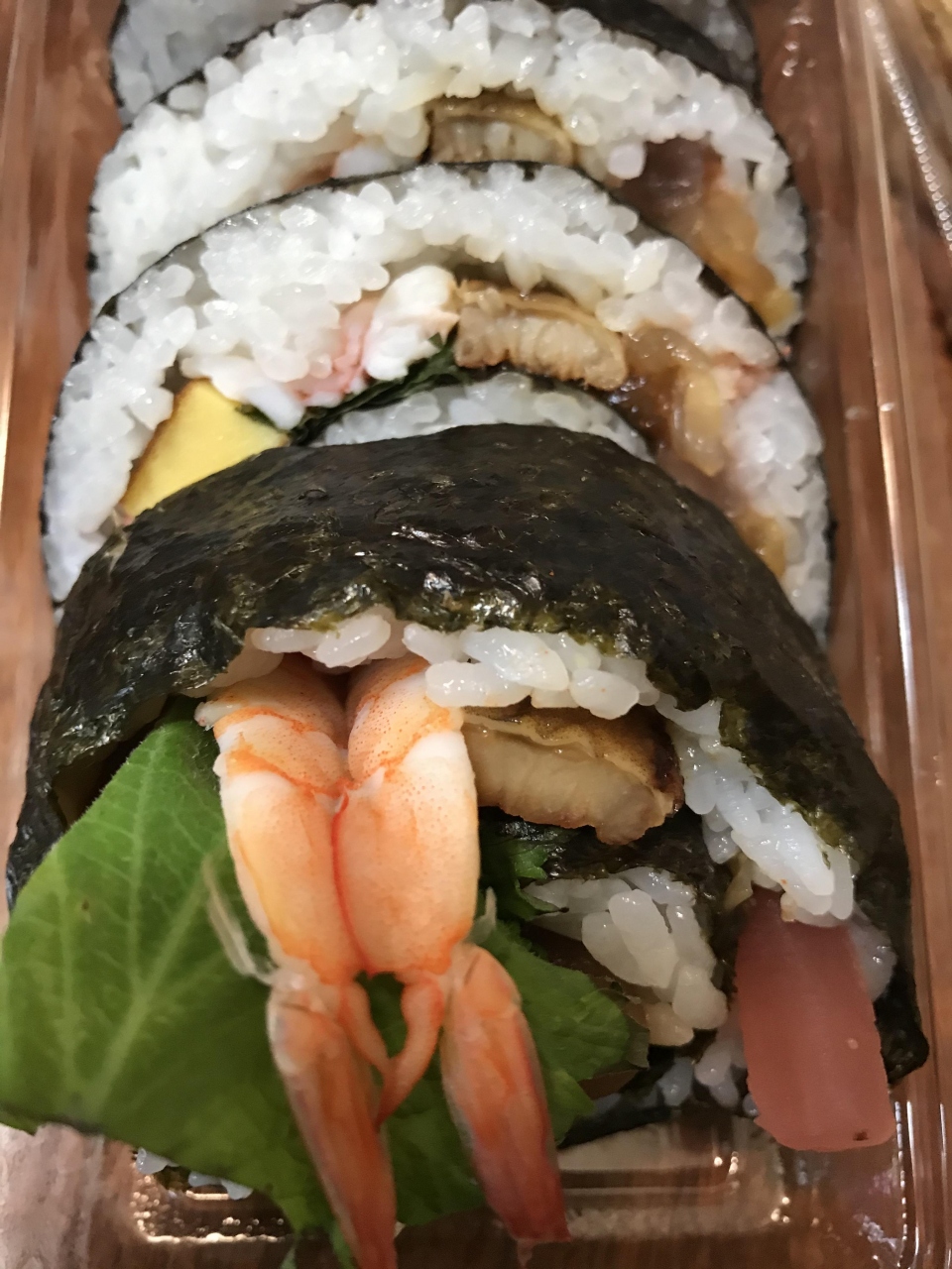 海老、穴子、胡瓜、椎茸、干瓢、たまご、カニカマ、マグロなどが綺麗に巻いてあって見た目にも綺麗。大阪発祥の店のせいなのか酢飯は甘め。ハーフにしたがボリュームあり。