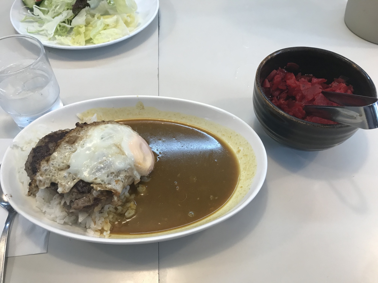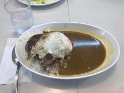 普通のカレーの他に、玉子カレー、カツカレー、チキンカレー(唐揚げ)などがあるのだが、一番のおすすめはバーグカレー。ハンバーグは注文してから整形し、焼き始めるので少々時間がかかるが、家庭で食べるようなアツアツの肉厚ハンバーグがトッピングされてくる。ハンバーグの玉ねぎは生を使っているので甘み+シャキシャキ感がある。バーグカレーを注文して正解。