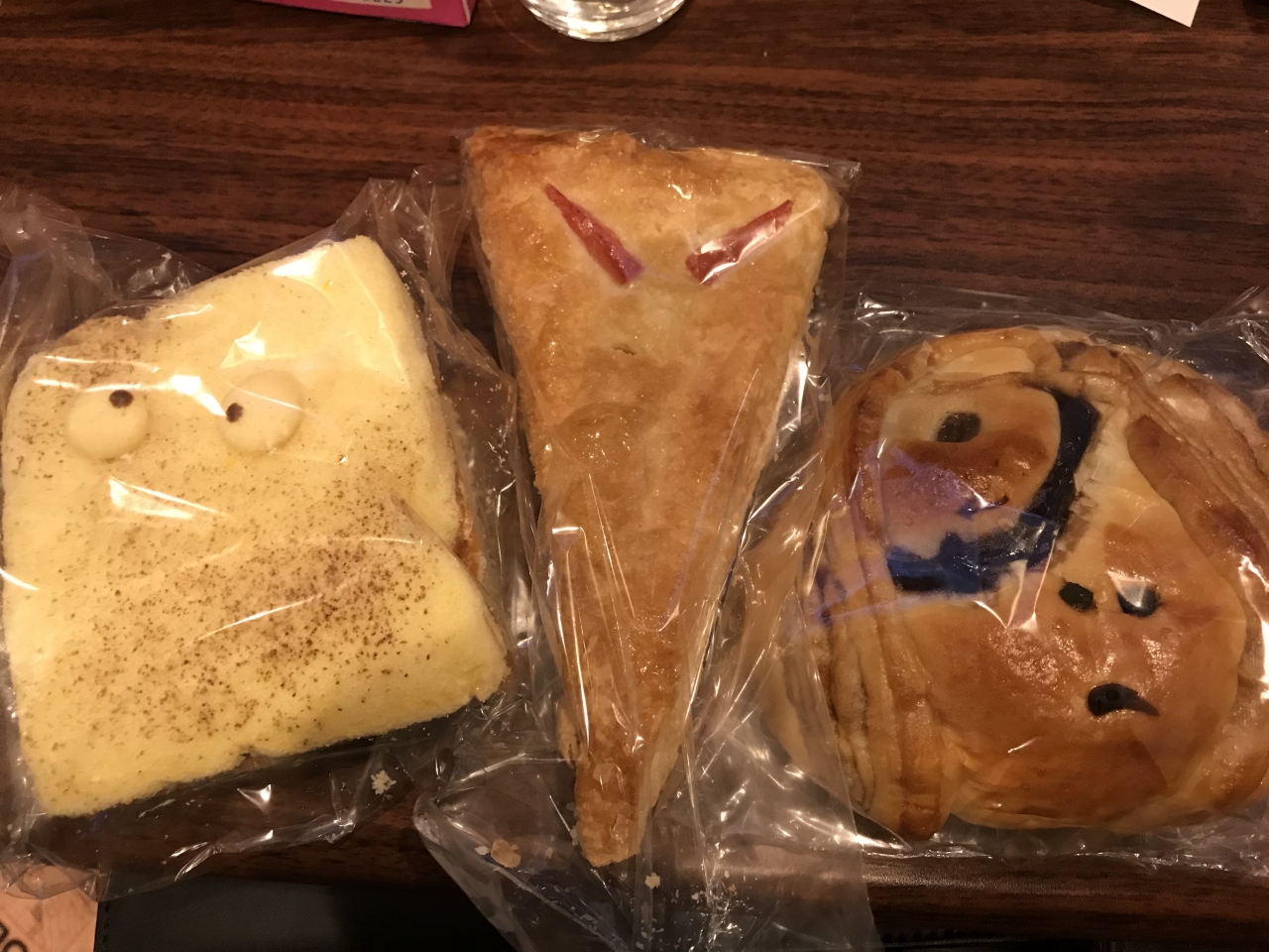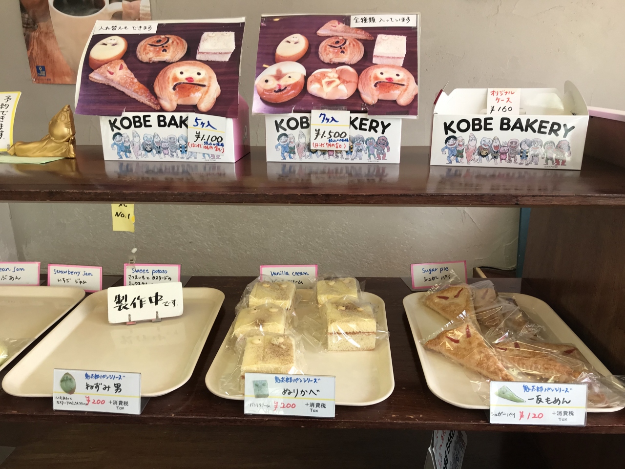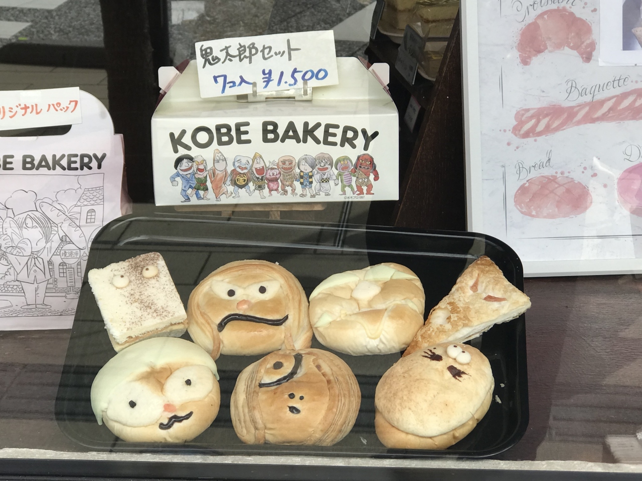 有名なのは鬼太郎キャラクターのパン。ケース販売もあるが、今回は今回は鬼太郎、ぬりかべ、一反もめんを模したパンを単品で購入。希望すれば有料(50円)で鬼太郎デザイン(水木しげる作)の袋に入れてもらうことも可能なので、そちらに入れてもらった。