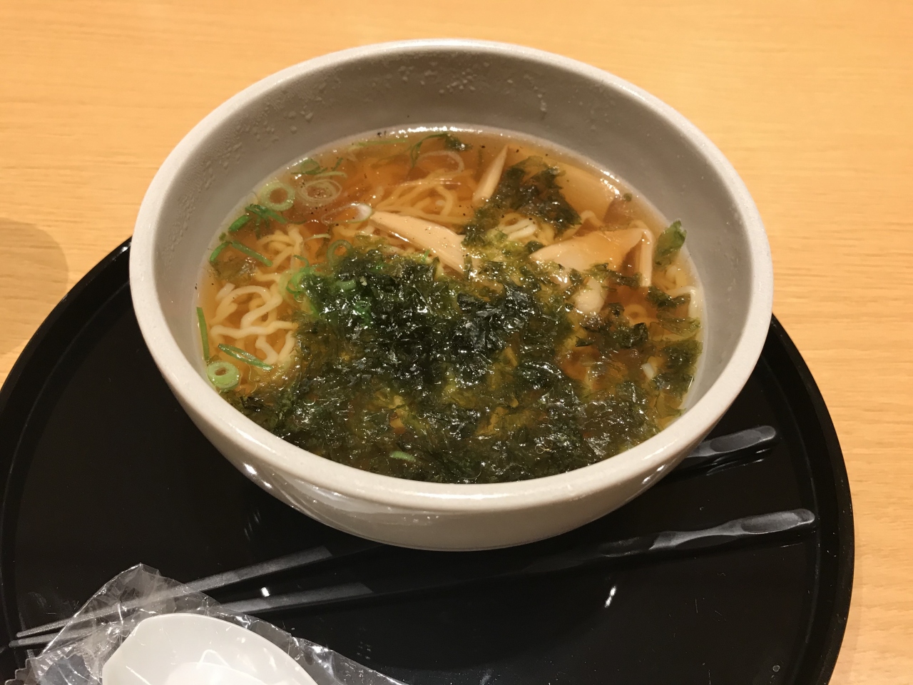 通常は朝、夜に地元で獲れた魚介類を中心としたバイキング料理を提供し、特に朝はいくらのせ放題等があるのだが、残念ながら2020年3月より当分の間定食(プレート)に変更中。とは言え人気店なので、当日予約しようとしたら夜・朝共に満員とのことで、21時から22時に提供される夜泣きそばをいただく。ハーフサイズの醤油ラーメンだが、あおさのおかげで磯の香りがして美味しい。
