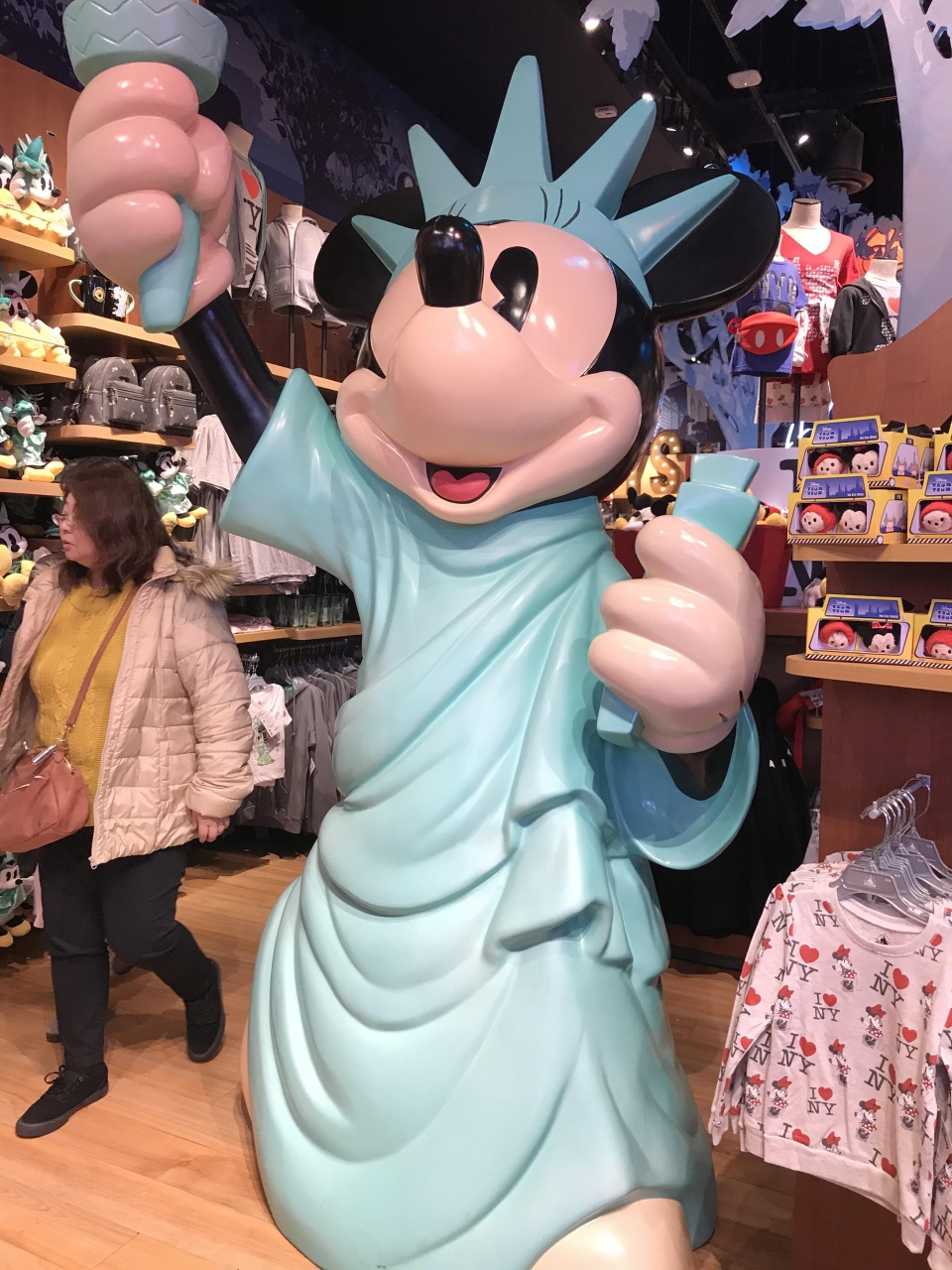 入口には自由の女神に扮したミッキーがお出迎え。記念写真を撮る観光客も多い。NYC限定品は入ってすぐのところに色々あるのでここで購入。