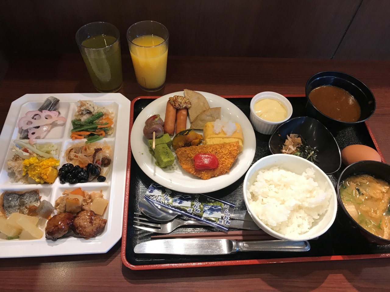 朝食は40種類以上、ごはんは岡山県産朝日米(これが美味かった!)、味噌汁の味噌は備前味噌、ままかりの酢漬け、白桃カレー、きび団子など岡山名物が色々、食べ過ぎてしまった。