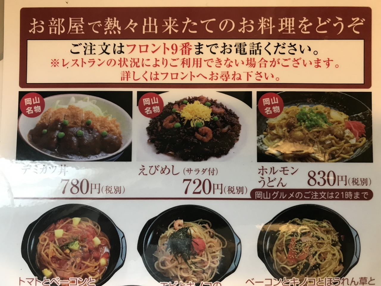 また、デミかつ丼、えびめし、ホルモンうどんと言った岡山B級グルメはホテルの部屋にルームサービスしてもらうことも可能。- 旅行時期