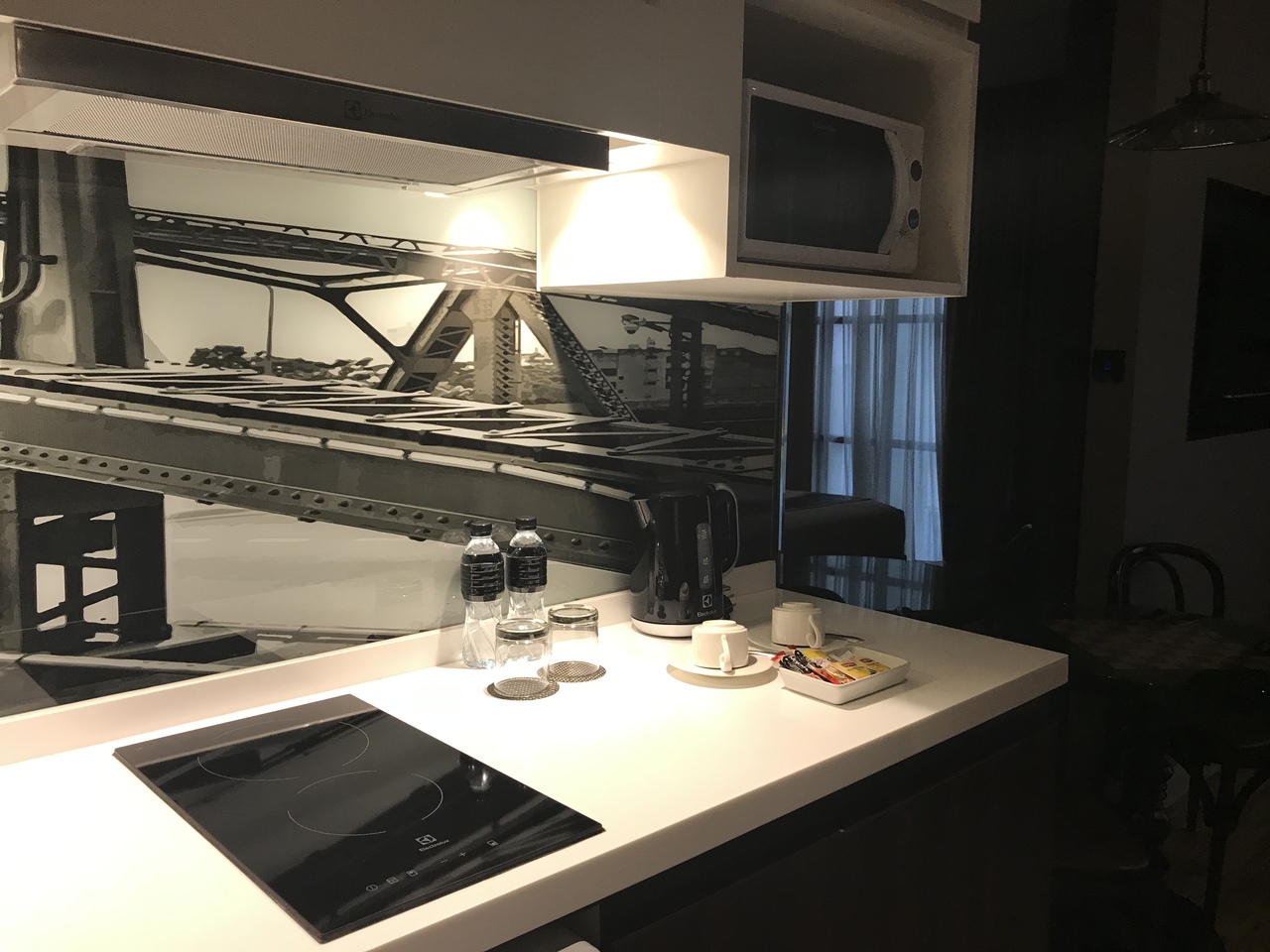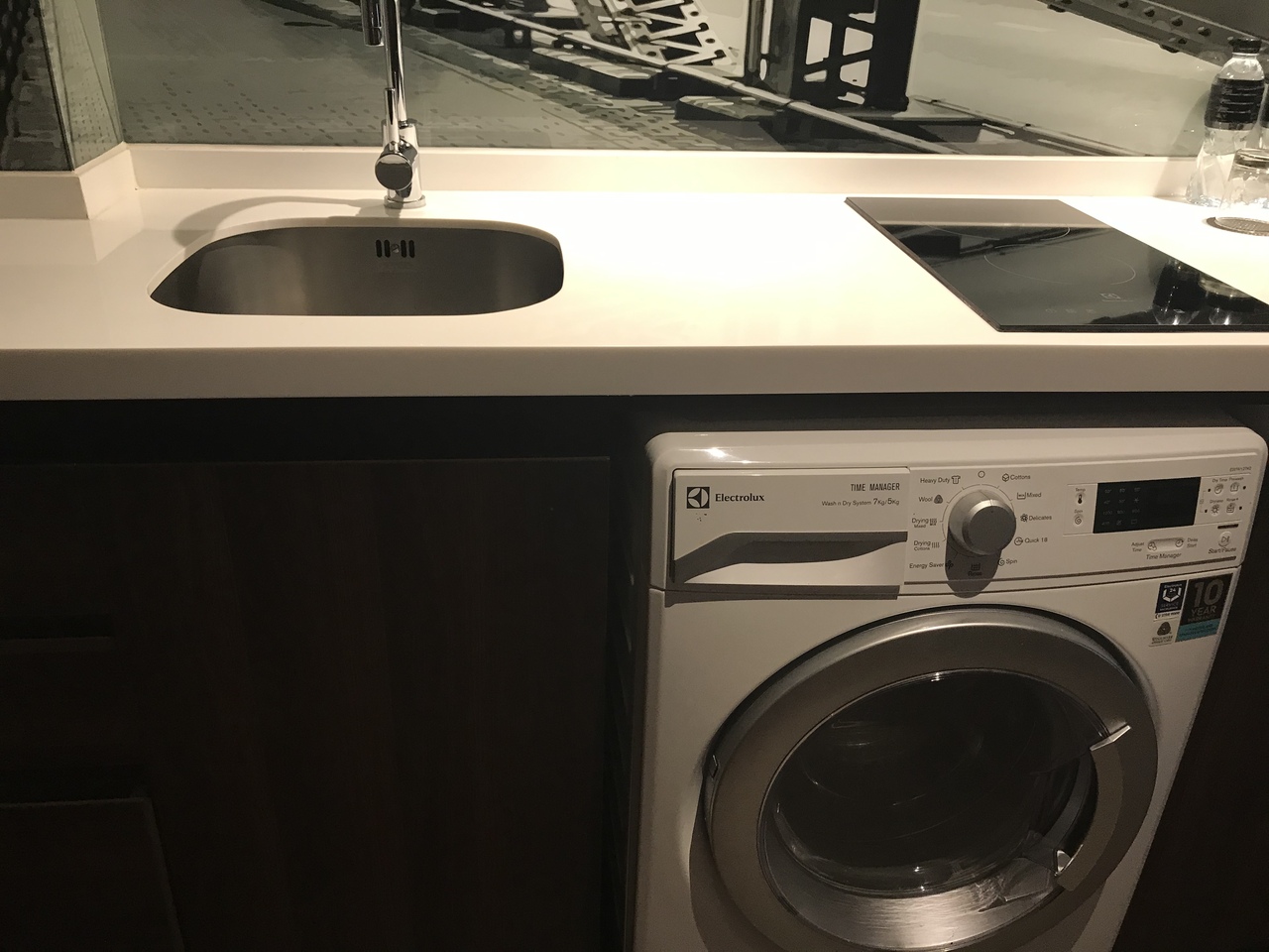 冷蔵庫、ミニバーだけでなく、流し台、電気コンロ、電子レンジもあって簡単な調理が可能(ただし皿、調理器具は見当たらず)。また、洗濯機もある。