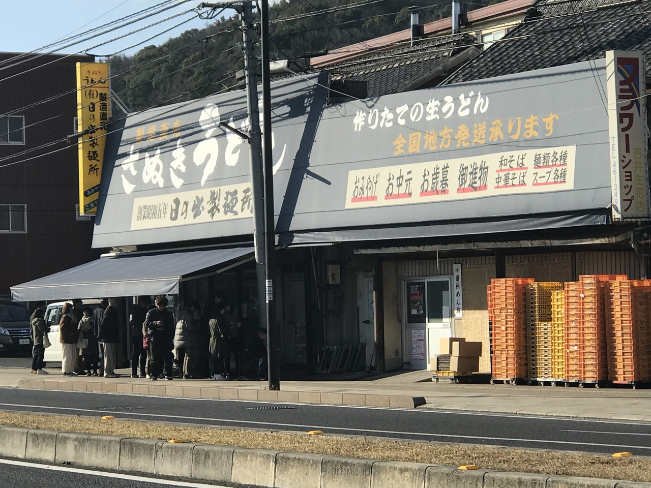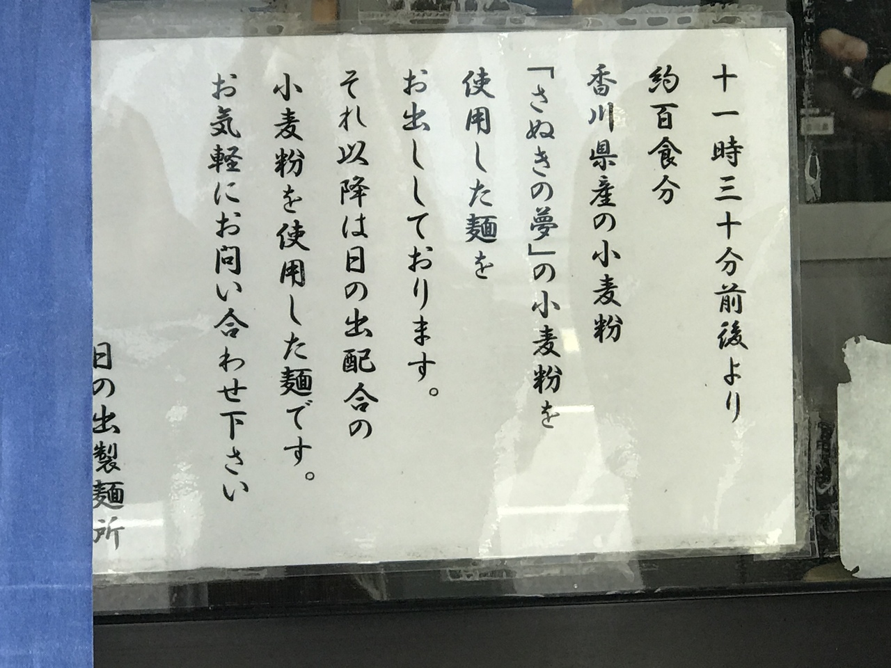 ここで製麺されたうどんは高松空港や三越などでも手に入るし、ネットショッピングでも人気らしいのだが、昼の11時30分から12時30分だけ店頭で打ち立てのうどんを食すことができる。また、100食のみ、香川県産小麦「さぬきの夢」を使用した麺を提供する。