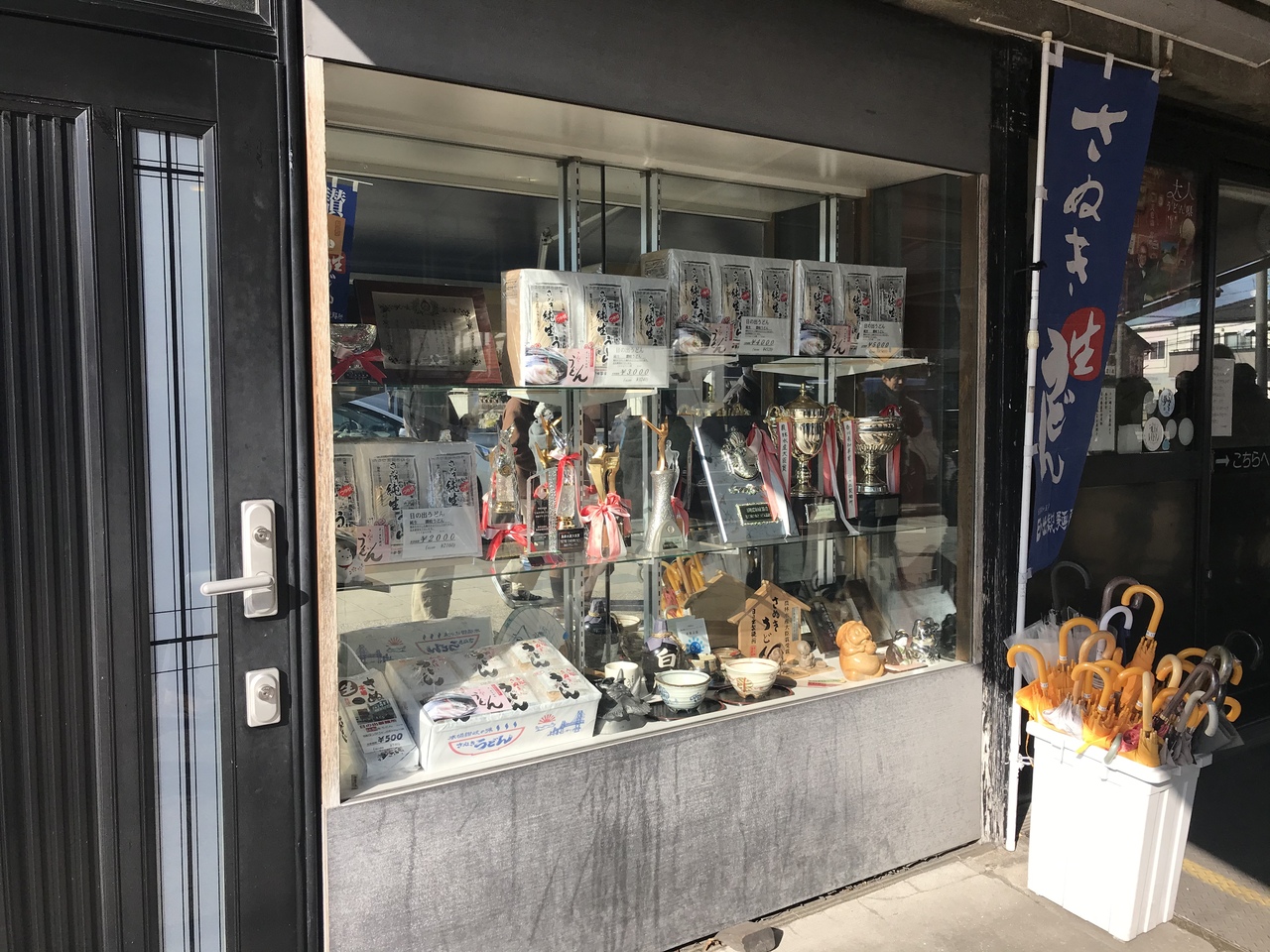 坂出市にある製麺所。JR坂出駅から600m程のところにある。大通りに面して2箇所の駐車場もあって誘導員もいる。
