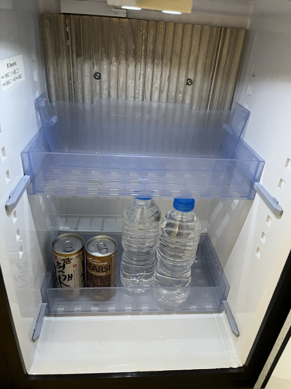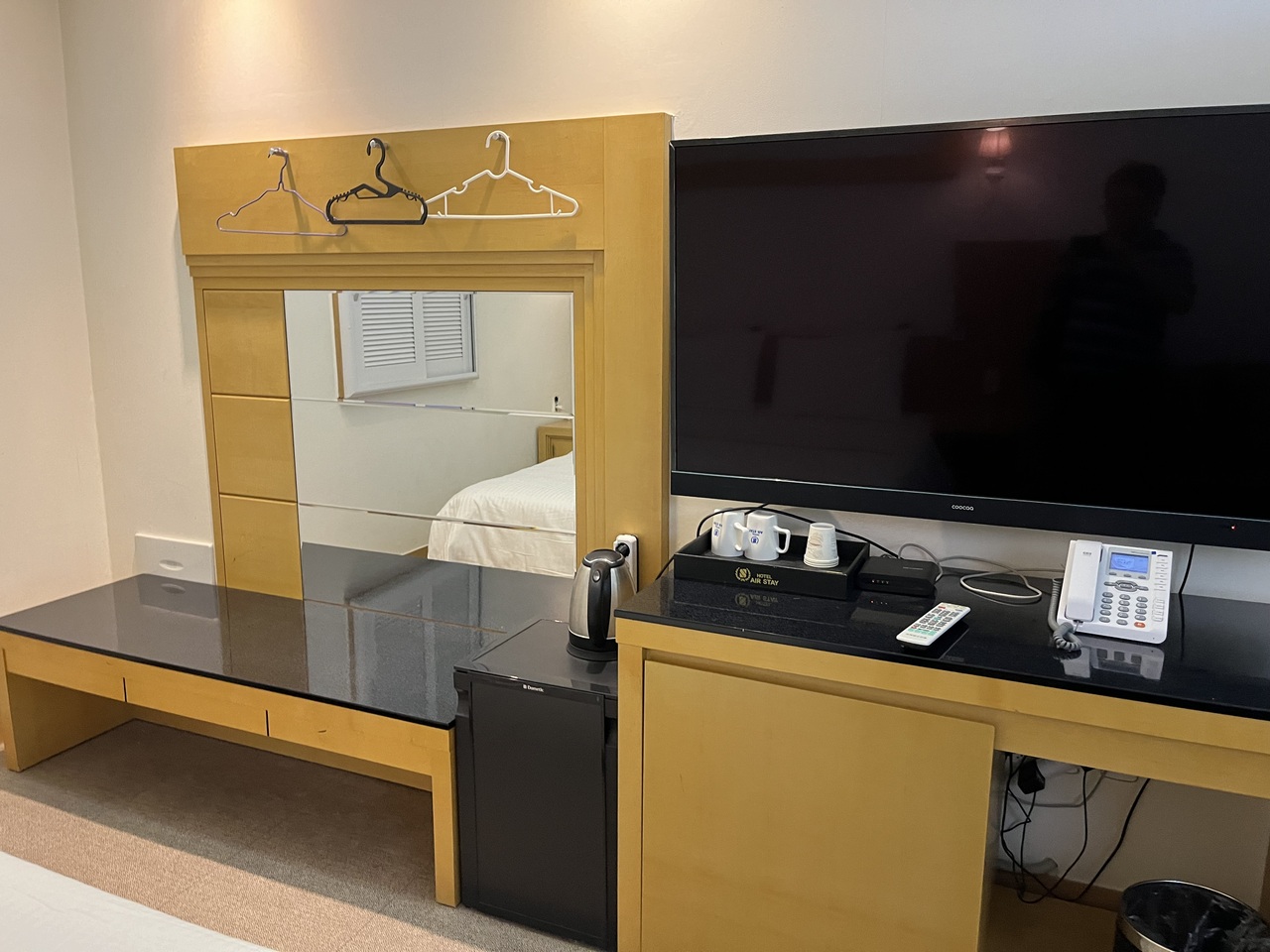 建物は古さを感じるが、部屋は綺麗に改装されている。ただし一部いい加減な部分もあるのでそこは理解の上で。防犯対策もしっかりしている。ベットは大きめ、寝心地は悪くない。ソファーと大型テレビがあって、Netflix、YouTubeも見られるらしいのだが、リモコンの使い方が少々難しい(説明書もない)。時間をかけて色々試してみたらNHKプレミアムも見れることが判明。洗面所、トイレ、バスルームは一体型。バスタブは無いが洗面所に水が出ない設計。アメニティも充実。韓国では珍しい歯ブラシまであった。