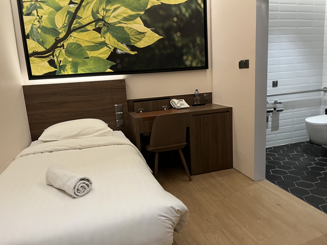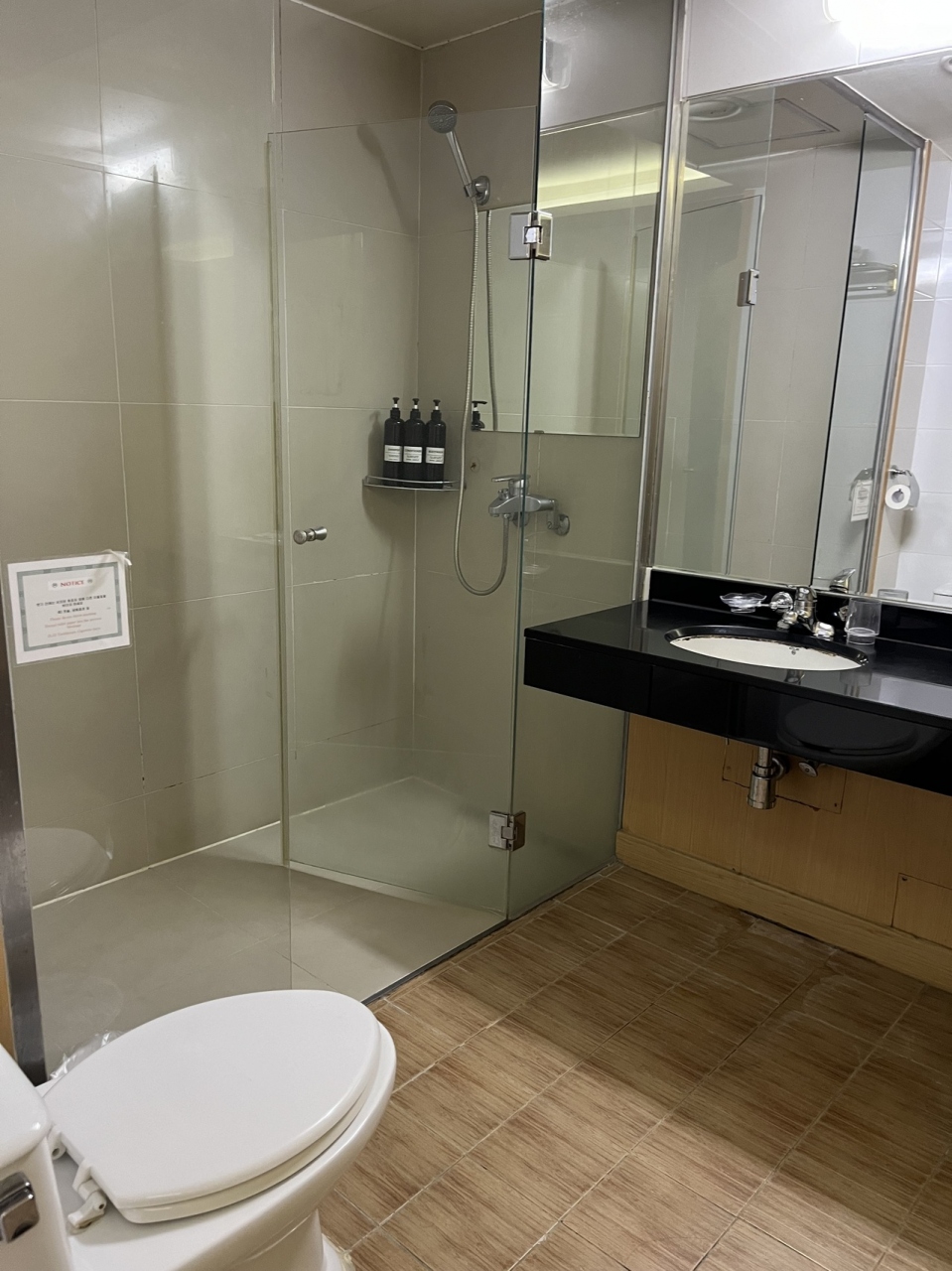 部屋は比較的広め、ハンディキャップルームであったため完全バリアフリーでバスルームは広め。ただしバスタブは無。部屋には仕事しやすい机とポット、冷蔵庫、セーフティボックス、中型の薄型テレビあり。ベッドの質感も悪くなかった。