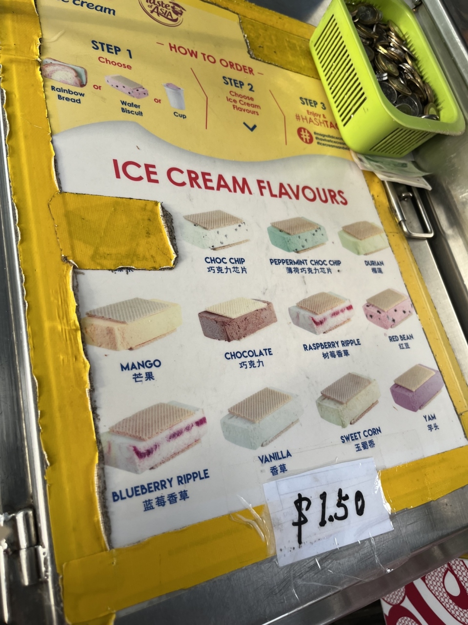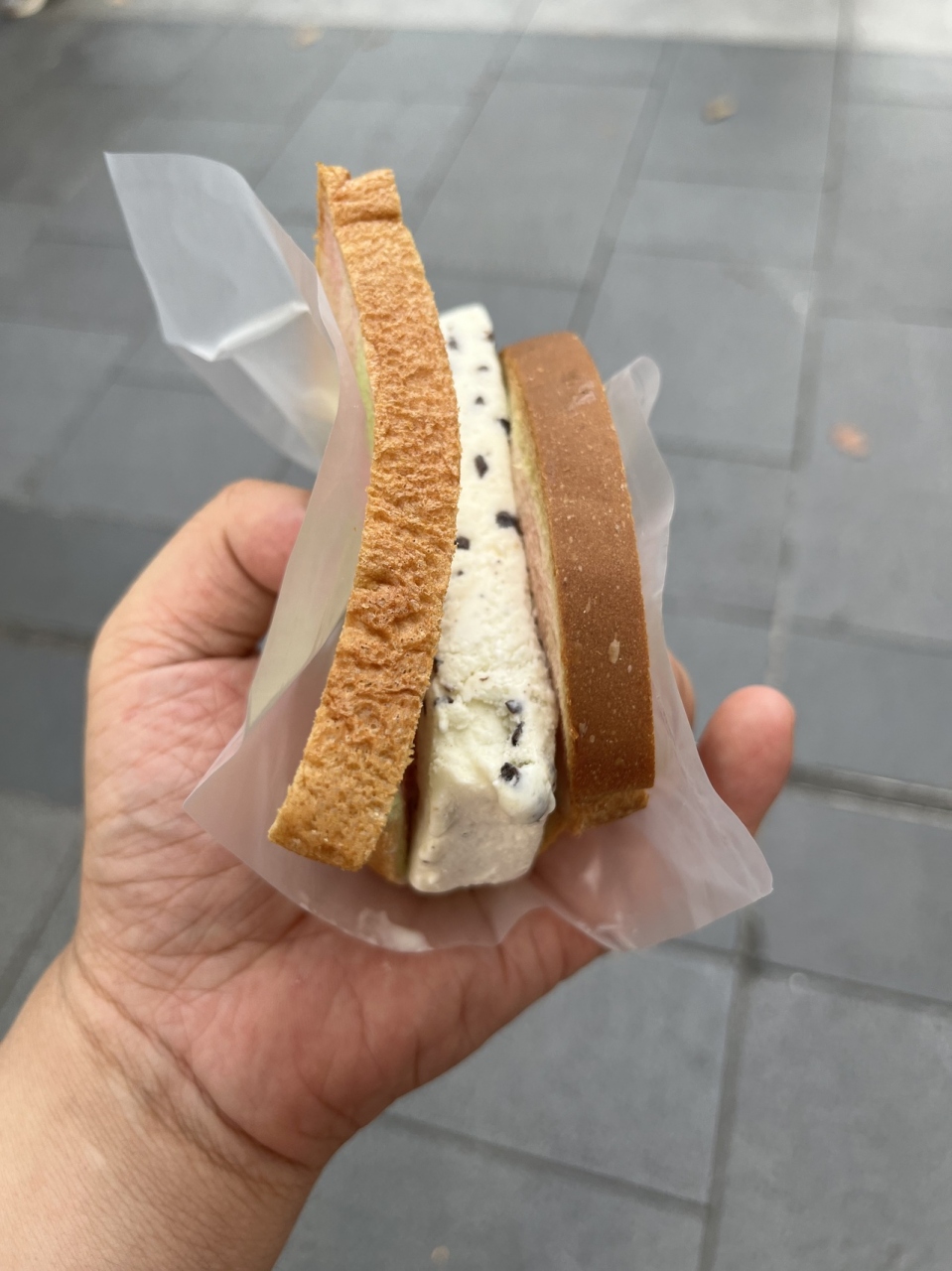 ドリアン、マンゴーなど東南アジア系のフレーバーもあるが、今回はチョコチップ。朱蒙するとその場で包丁で切り、半分に折ったパンにはさんでくれる。アイスが意外にボリュームがあるので、チョコチップがアクセントになって最後まで飽きない。