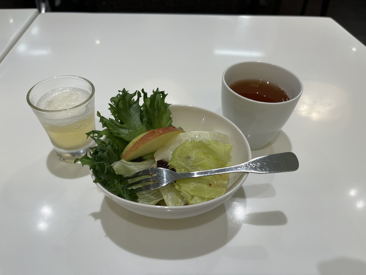 まず、烏龍茶、泡茶(甘い柑橘系のお茶を凍らせたもの)、オーガニックにサラダが到着。お茶は天仁茗茶だけに美味しい。サラダのドレッシングも酸っぱ過ぎ食べやすい。