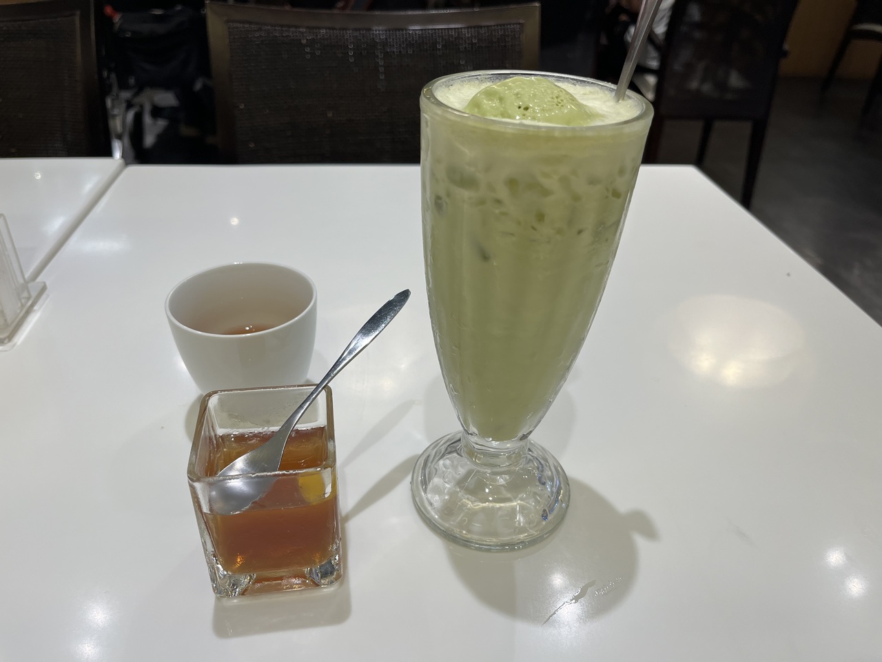 最後に美人蜜柑茶凍(お茶のゼリー)と抹茶フロートが到着。抹茶フロートは甘さ、氷の量が指定できるので、どちらも少なめを選択。抹茶の苦さとアイスクリームの甘さがほどよくお茶の香りも楽しめた。