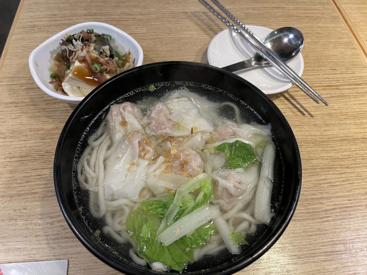 鮮肉饂飩麺は豚肉のワンタン麺。麺は刀削麺と細麺があるが、今回は細麺に。饂飩だが秋田の稲庭うどんに近い感じ。スープは透明、塩ベースのあっさり目。ワンタンの味を損なわない。
