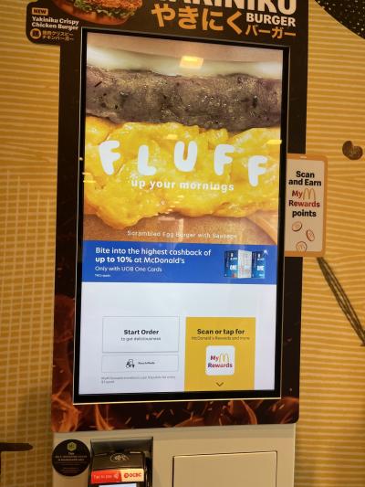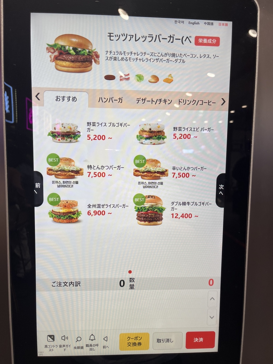 注文は自動注文機。多少おかしいが日本語もあるので比較的スムースに進む。ちなみにマクドナルドの自動注文機に日本語は無い。