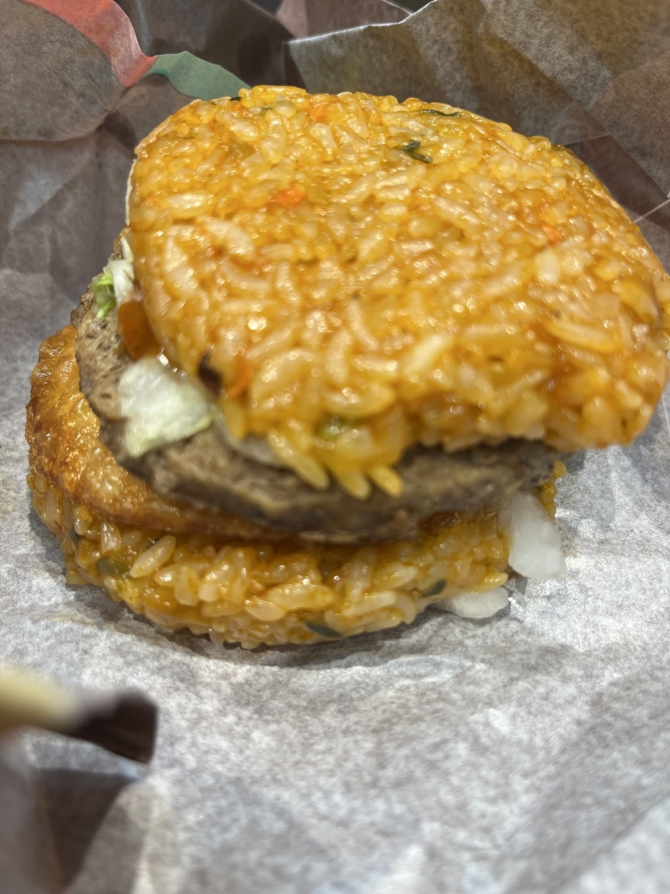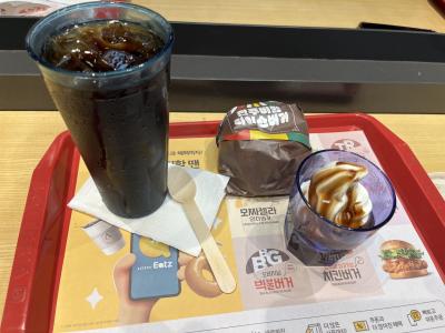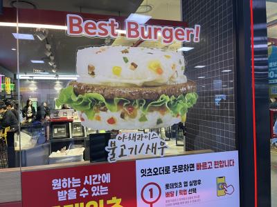 日本のロッテリアでもお馴染みのメニューに加え韓国産牛肉(韓牛)利用のバーガーやブル漕ぎバーガーもあるが、今回は全州混ぜライスバーガー(日本語名)を注文。全州はビビンバの本場と言うことで興味が魅かれる。