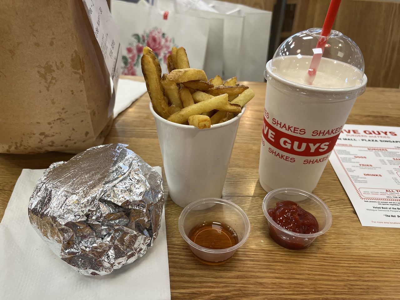 1986年アメリカバージニア州アーリントン郡に開店、バラク・オバマ元米国大統領もファンと言われているハンバーガー店。アジアでは香港、韓国などでも見かけるが日本は未進出。最近開店したソウル(ザ・現代ソウルの地下、ソウル駅ロッテマートの付近にある/2024年5月現在)は閉店近くまで大行列だが、シンガポールの2店舗はブームが過ぎたようで、行列は無く比較的空いており、今回はIONオーチャード地下にある店に入店。