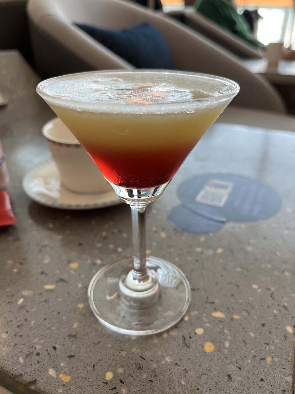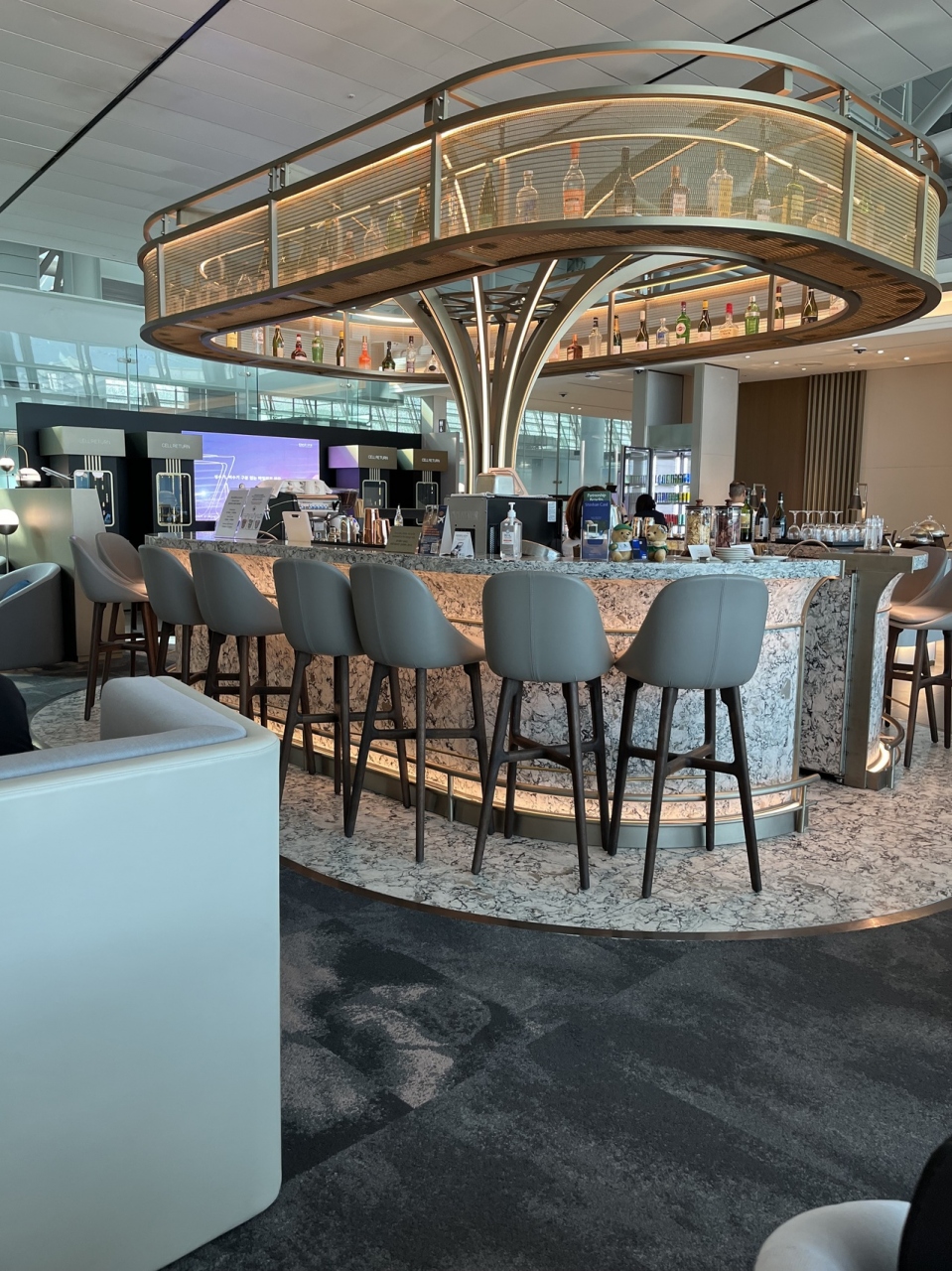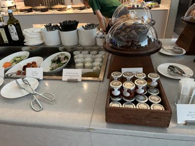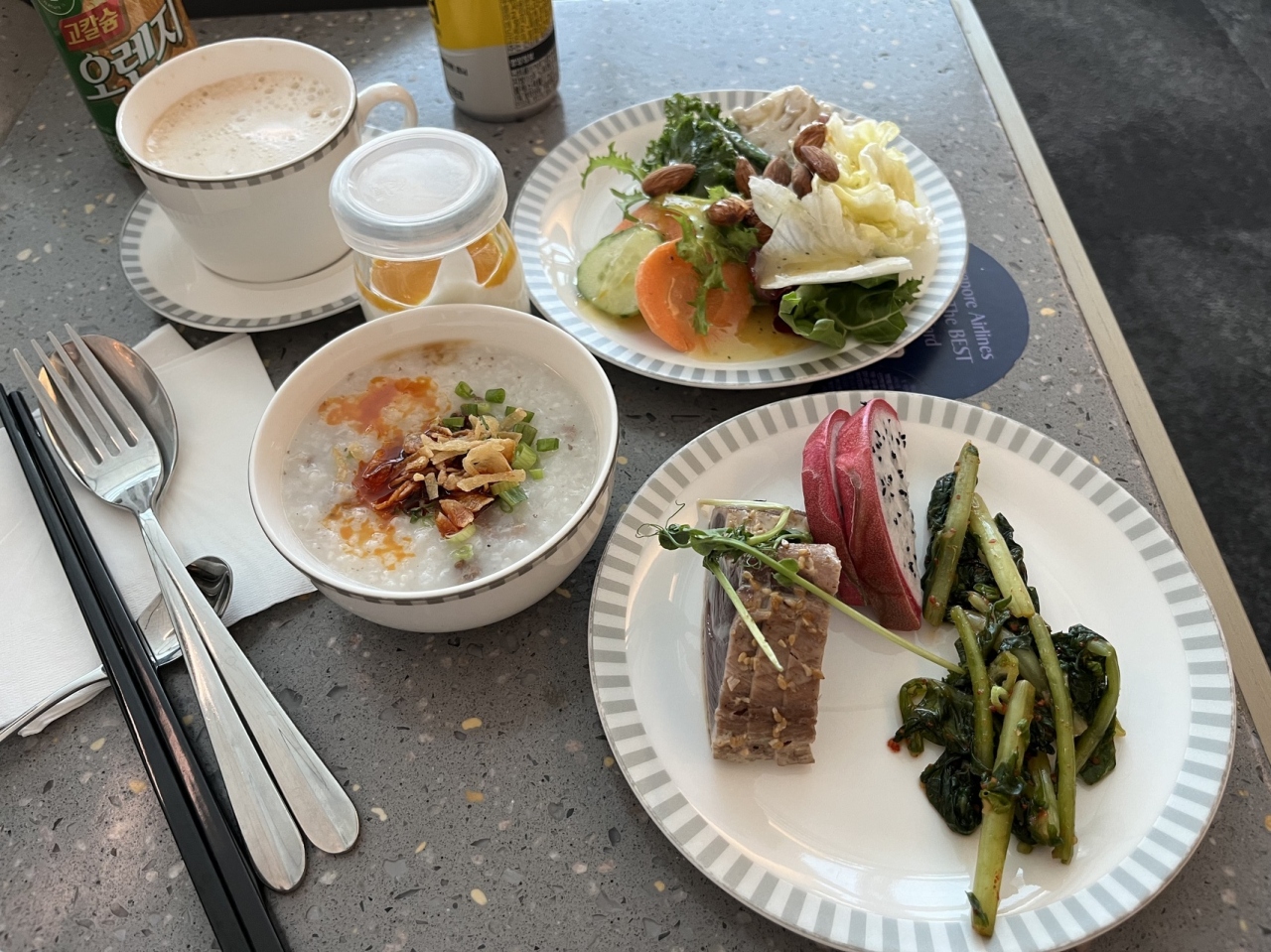 一番感動したのは食事、アルコール。他のシルバークリスラウンジと同様に非常にクオリティが高い。朝8時頃に入場したが、牛肉粥があったり、パンの種類が豊富。ジャムやヨーグルトは瓶に入っているなど、ワンランク上の味を提供。またバーカウンターではシンガポール航空オリジナルカクテル(SilverKris Sling、Krius Club)を始めとしたカクテルが提供される。またラテ等を頼むことも可能。