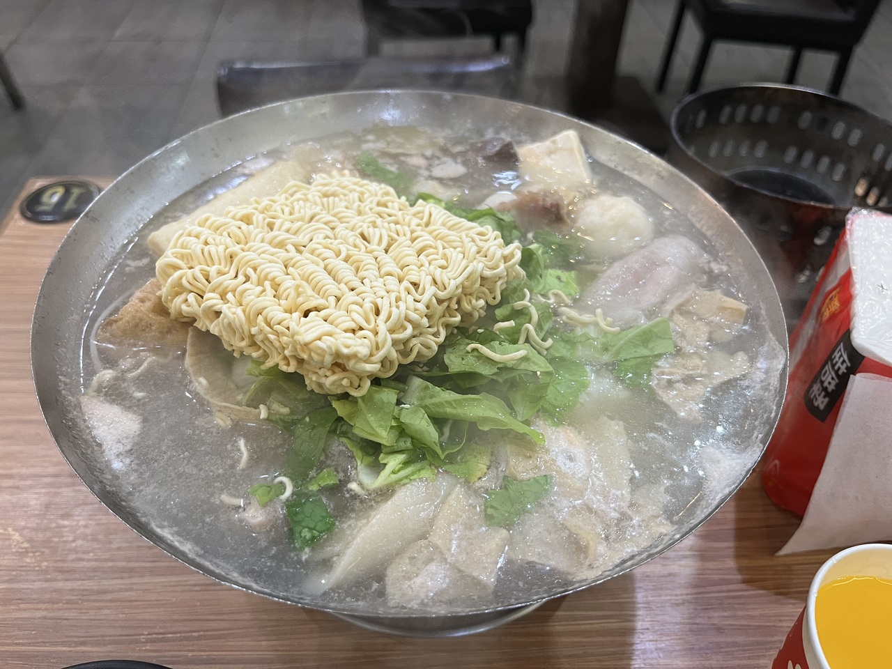 海鮮豆腐鍋に玉子麺を追加。名前の通り海鮮から出汁が出ていて、それを吸った冬粉(春雨)がいい味を出す。タレは少しだけかける程度。日本の鍋のようにポン酢につけてというイメージではないのでご注意を。- 旅行時期