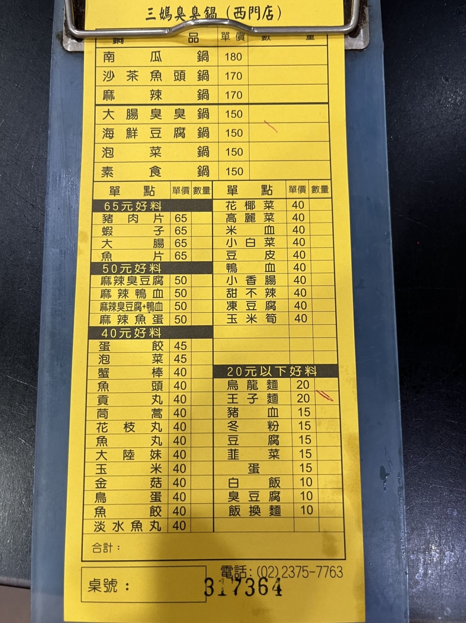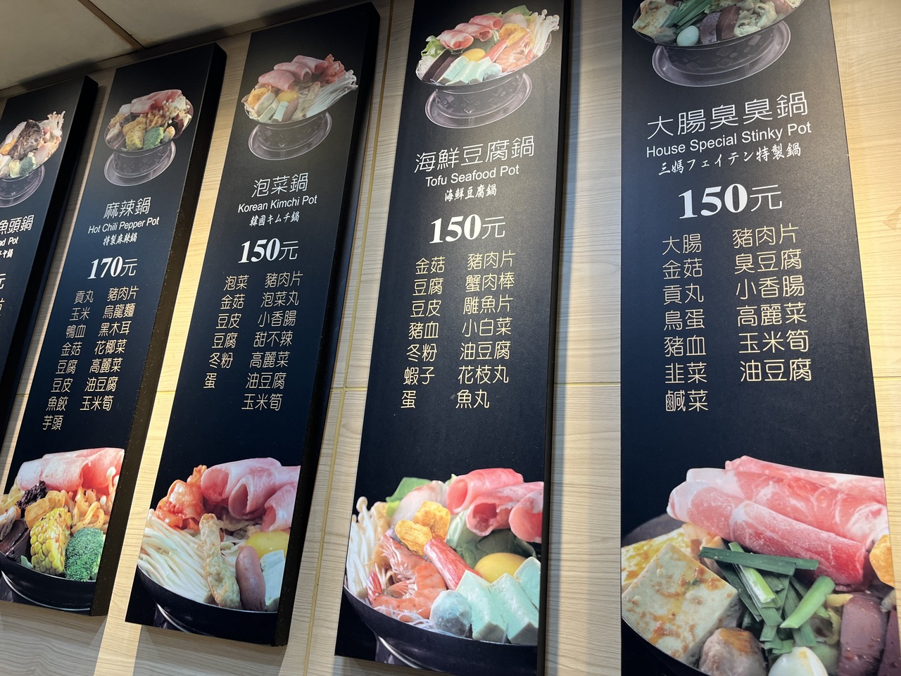 臭豆腐を使った大腸臭臭鍋が現地の人には人気のようだが、麻辣鍋、海鮮豆腐鍋、泡菜鍋(キムチ鍋)、沙茶魚頭鍋、南瓜元寶鍋などのメニューがあり、店内は臭豆腐のきつい臭いは無いのでご安心を。