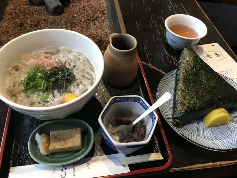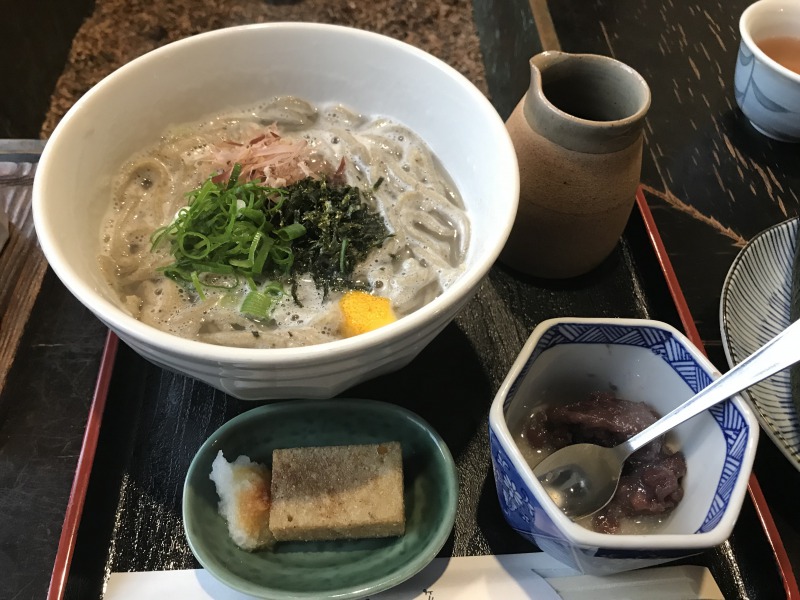 まず、かまあげそばが到着(蕎麦を注文すると蕎麦がきと蕎麦ぜんざいがつく)。10割そばはいつも見かけるそばより太め。茹でたてそばが蕎麦湯と一緒に入っており、濃いめのつゆ、薬味をかけながら頂く。そばは洗っていないので、蕎麦湯はとろみがある。
