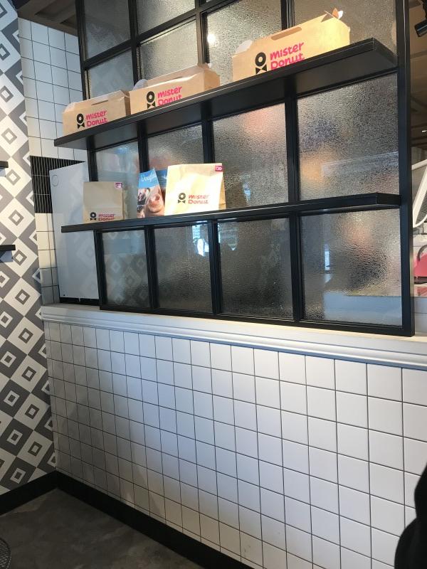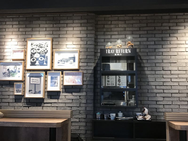 元々カフェだった店の居抜き出店なので、店内な雰囲気は他のミスドと違い、洒落たカフェの感じ。昔アメリカにあったお店の白黒写真が飾れていたり、トレーの返却口も格好いい。
