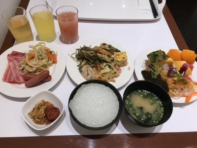朝食をいただきましたが、朝食バイキングで定番のメニューに加えて沖縄風天ぷら、沖縄風やきそば、もずく等沖縄らしいメニューも少々。味は悪くない。