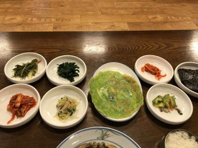 ケジャンが来る前におかずがいろいろ…。中でもニラをすり潰したチジミが美味しかった。思わずおかずまで完食してしまいました。