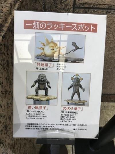 なお、店内には「ラッキースポット」と呼ばれる彫刻が3か所。1階正面入り口には「昇運童子」、シャミネ側入り口には「追い風童子」、2階駐車場連絡口には「火伏せ童子」が(駐車場連結口)。どれも薮内佐斗司先生の彫刻である。- 旅行時期