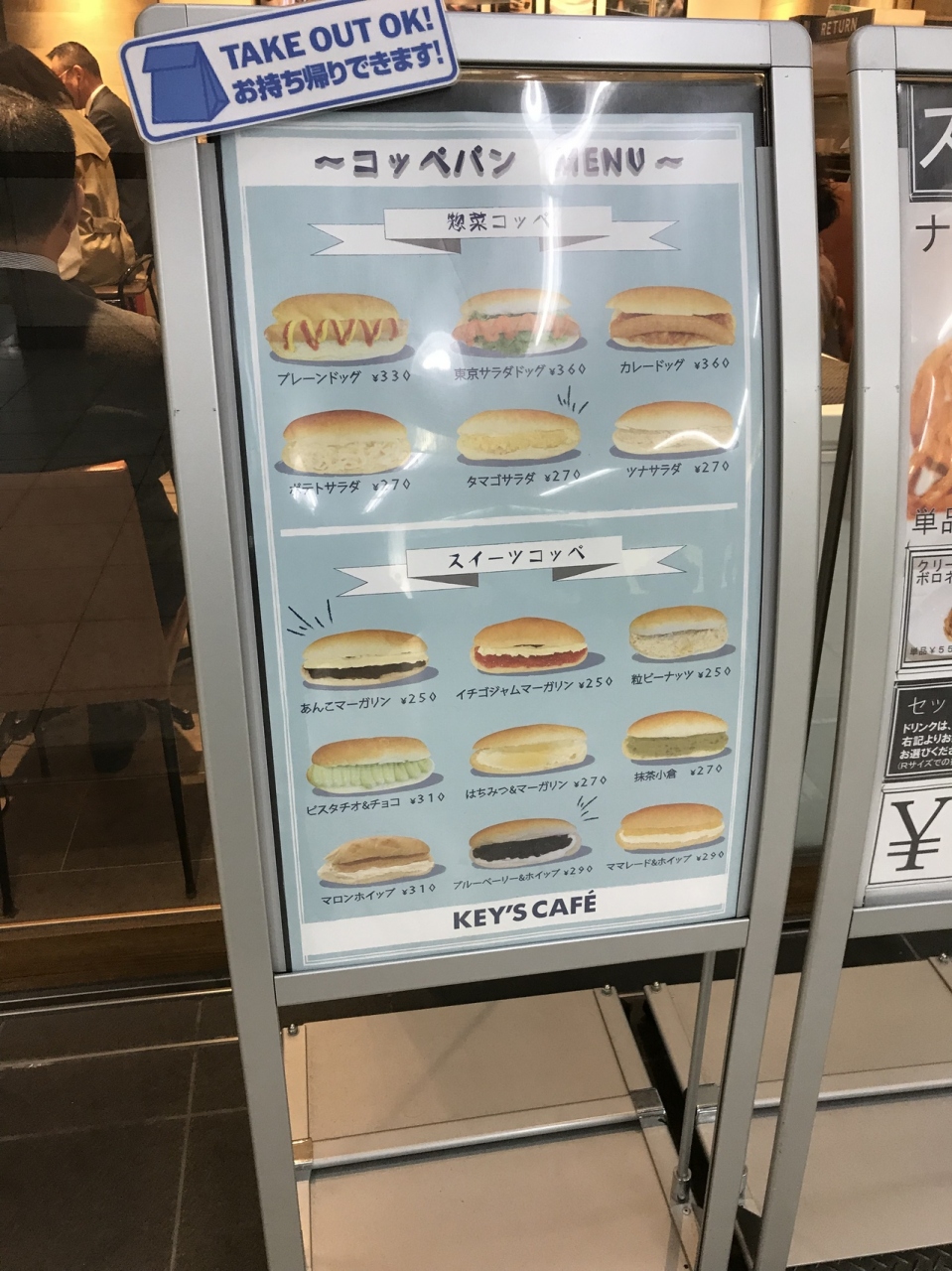 コーヒー以外にパスタやパン類が充実。中でもコッペパンは惣菜系が6種類、スイーツ系が9種類あって、注文するとその場で中身を挟んでくれます。コッペパンとドリンクは一緒に注文すると割引あり。