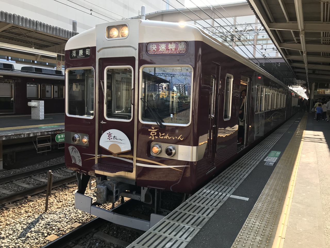 阪急京都線の観光特急。土曜・休日ダイヤに快速特急(大阪市の淡路駅から京都市の桂駅までノンストップ)して乗車できる。駅の時刻表に京とれいん・2ドア車と表示してあるので、タイミングが合えばラッキーである。