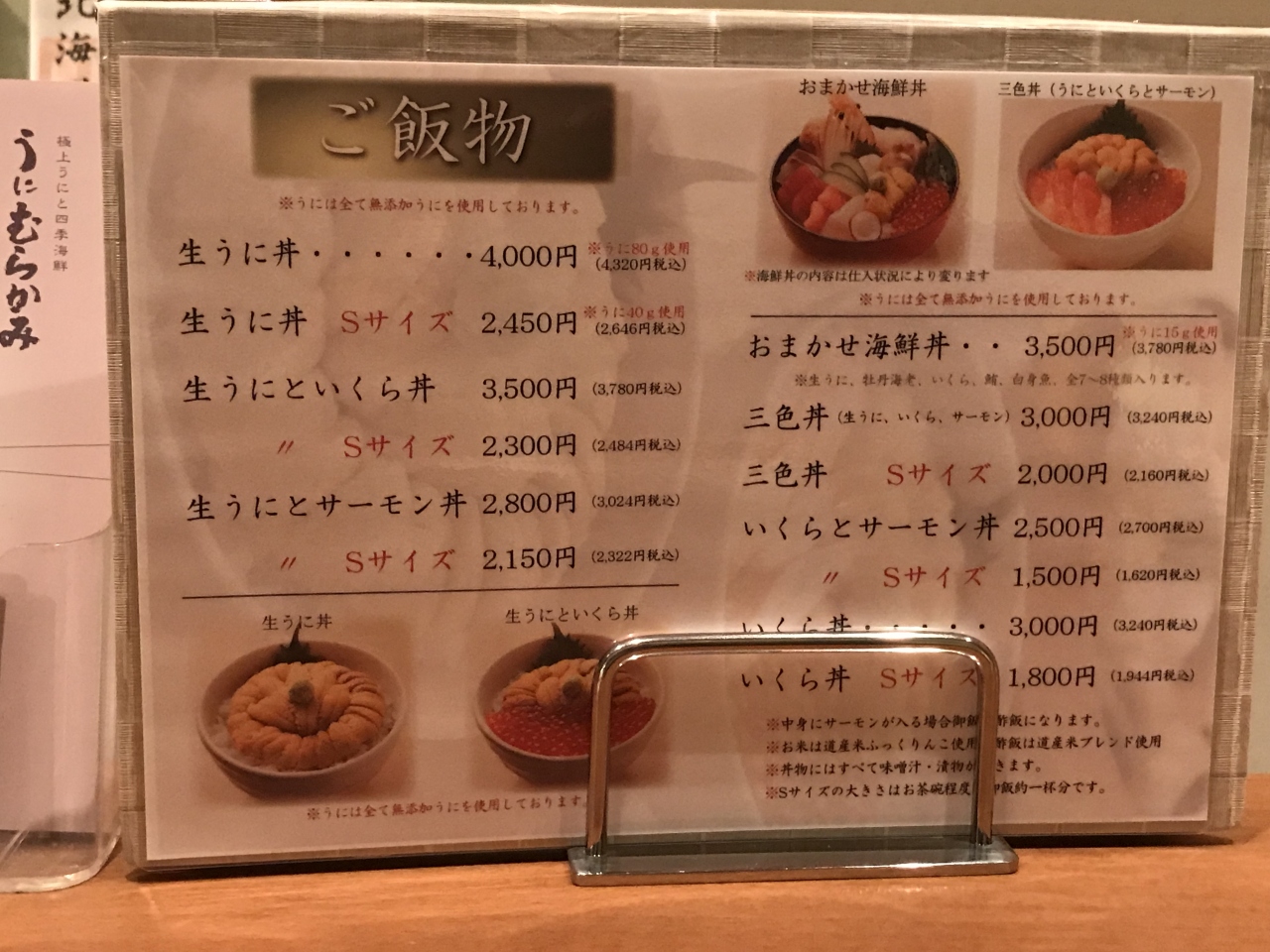 うに料理のメニューは色々、コース料理もあり。うに丼も半分がいくらが入ったもの、海鮮丼等あり。お米は道産米ふっくりんこを使用しているとか。ちなみにサーモンが入るとごはんは酢飯(酢飯は道産米ブレンド)になる。