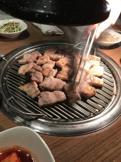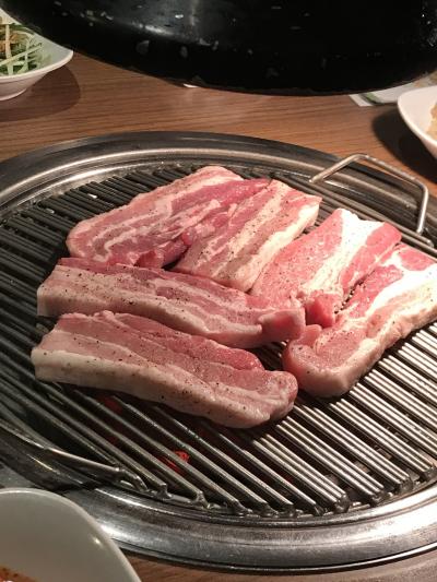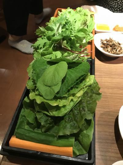 サムギョプサルのセット(サンパセット)を注文。韓国の焼肉屋て提供されるような数種類のおかず、サンチュ、サニーレタス、エゴマ、人参などの生野菜類は食べ放題。肉よりも野菜をたくさん食べた感覚になります。