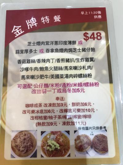夕食時(と言っても21時ころだが)に入店、金牌特餐というセットを注文。セットと言ってもメイン、サイド、ドリンクを選ぶ必要があり。広東語がわからない場合は店員にメニューを指さす必要がある。