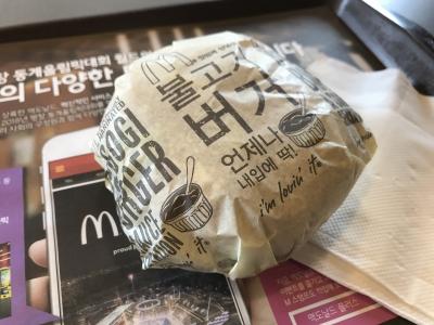 アジアのマックの店舗に多い自動注文機(なぜか日本には無い?)で韓国名物?のプルコギバーガーを注文。単品はロッテリアよりもリーズナブル(2000ウォン)。味は照り焼きバーガーにニンニクの香りがする感じ。