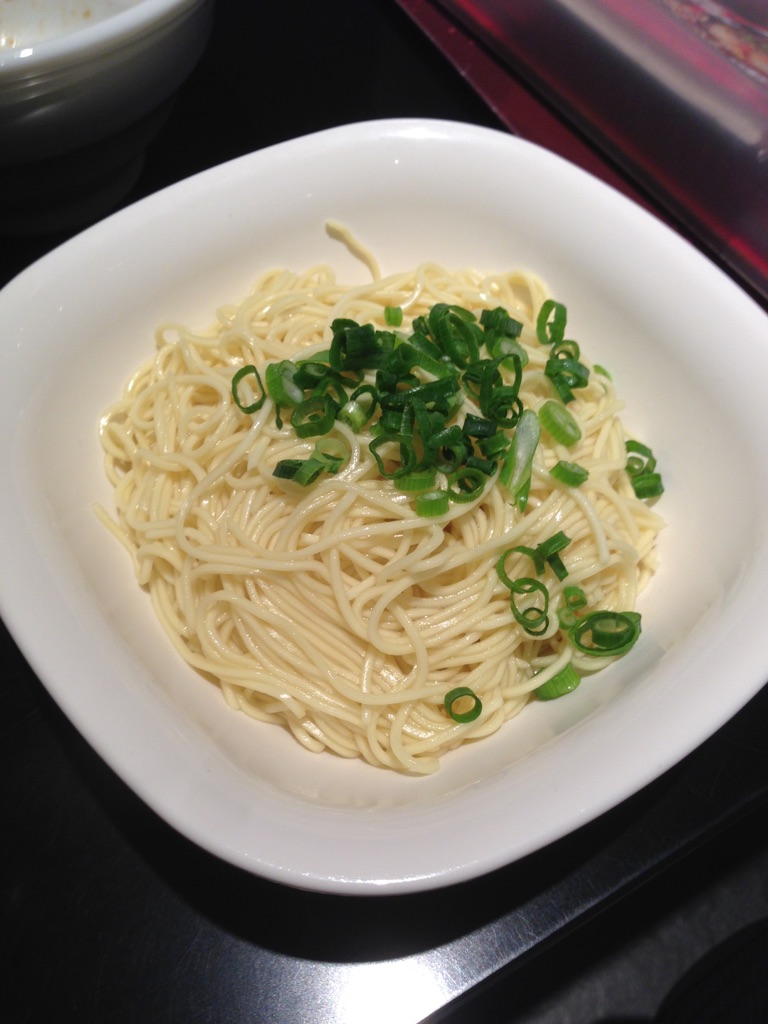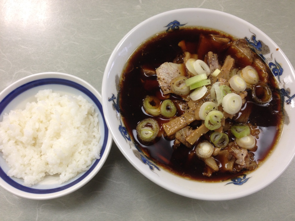 ラーメンは真っ黒なスープの上に白いネギとチャーシューが鎮座。大量の胡椒がかけてあるのですが、塩辛い味。元々肉体労働者の塩分補給を意識して考えたととか。なので白ご飯が必須(本店は白ご飯がメニューに無いのですが、この店は白ご飯がメニューにあります)。ラーメンをおかずにして白ご飯が進みます。麺は太めでやや固め。スープの味を考えるとこの方が良いと思います。