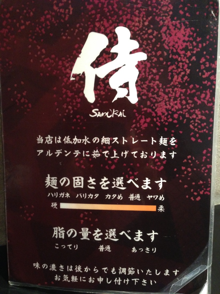 和風とんこつを注文。九州ラーメンのように麺の硬さ(ハリガネ、バリカタ、カタめ、普通、ヤワめ)、脂の量が選べます(麺は替え玉もあり)。ただし紅ショウガ、ニンニクは無い。