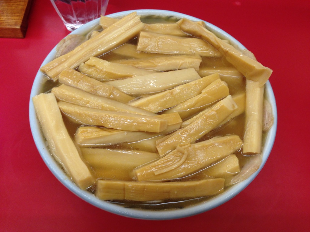 ここに来たら食べたいのは大盛メンマ(大竹)かスペシャルメンマ(寿竹)。メンマというとラーメンの具の一部でちょっとした口直しのイメージかもしれませんが、ここのメンマはメイン。麺が見えないほど盛られたメンマは筋が全くなく、柔らかく煮てあってとても食べやすい味(台湾の高級メンマを使っているとか)。大量のメンマが最後はもっと欲しくなるかも。スープは一瞬こってりした感じに見えるもののあっさりとした味で最後まで飲み干せます(テーブルにお酢等があるので混ぜて味を楽しむのも良いかもしれません)。